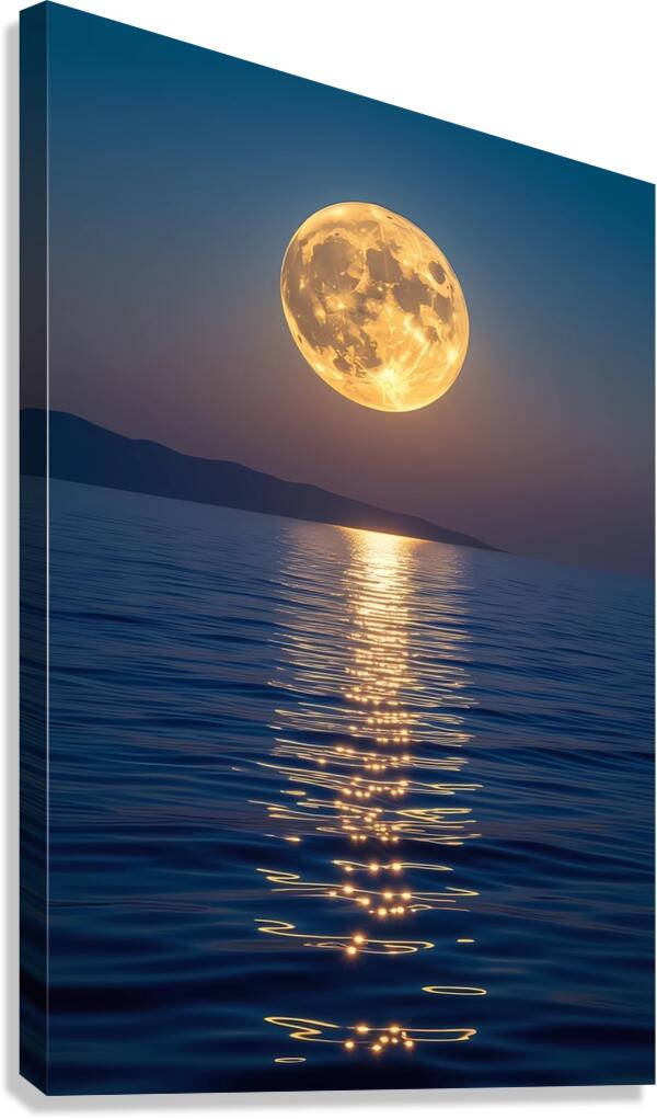 A magnificent golden full moon rises above the calm sea, casting a shimmering trail of light across the gentle waves. The distant silhouette of the mo...[+]