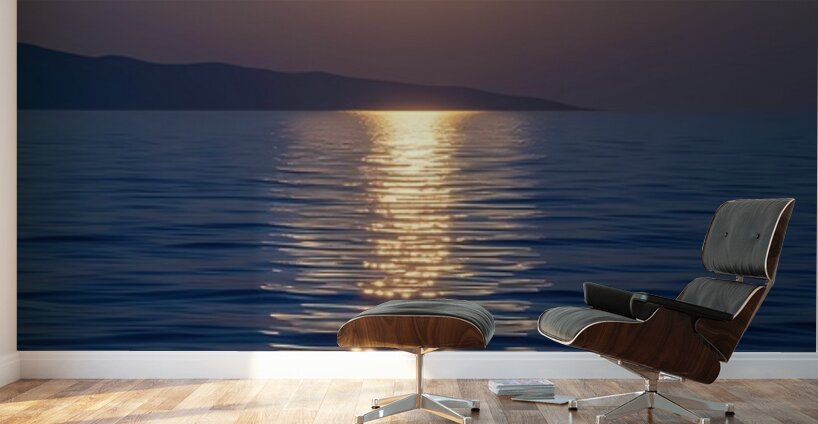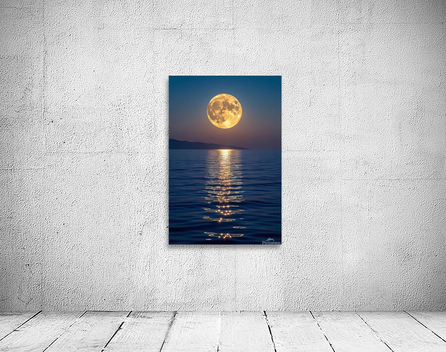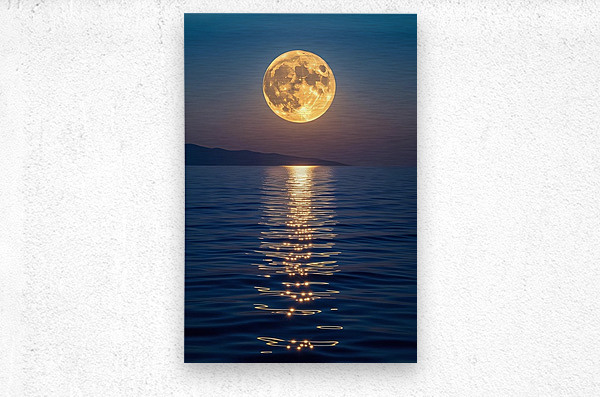 A magnificent golden full moon rises above the calm sea, casting a shimmering trail of light across the gentle waves. The distant silhouette of the mountains enhances the scene, creating a breathtaking blend of serenity, mystery, and natural wonder.