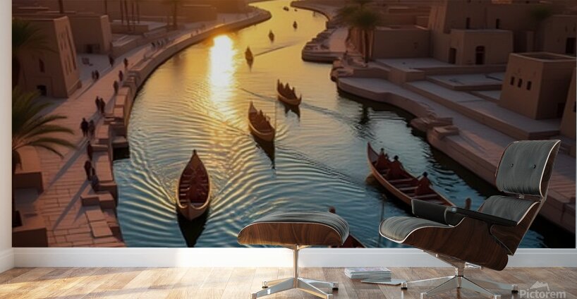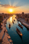 A breathtaking sunset bathes an ancient canal city in golden light, with traditional boats gliding gracefully across the shimmering water. Palm trees ...[+]