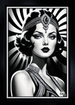 Radiant Glamour Of The Bygone Era Beauty Lanthia Valariana AI Concept Art by Xzendor7; presents an exquisite black-and-white illustration that transports viewers to the roaring twenties. This captivating portrait showcases a stunning woman adorned in period attire, her gaze both alluring and enigmatic against a backdrop of radiating lines. The artwork’s meticulous detail and masterful use of grayscale tones create a timeless aesthetic, evoking the elegance and sophistication of the Art Deco era while hinting at deeper themes of female empowerment and self-expression. It is a truly remarkable piece that seamlessly blends technical skill with artistic vision.
