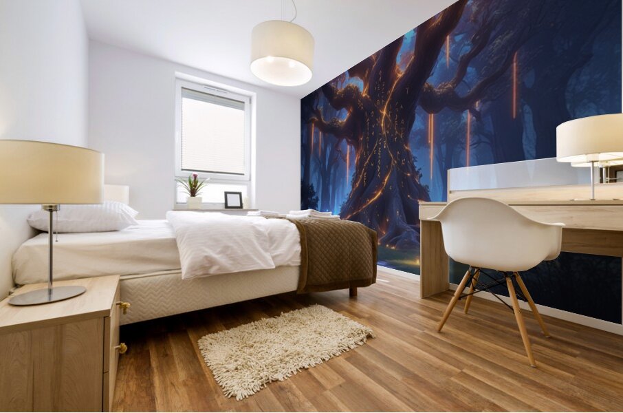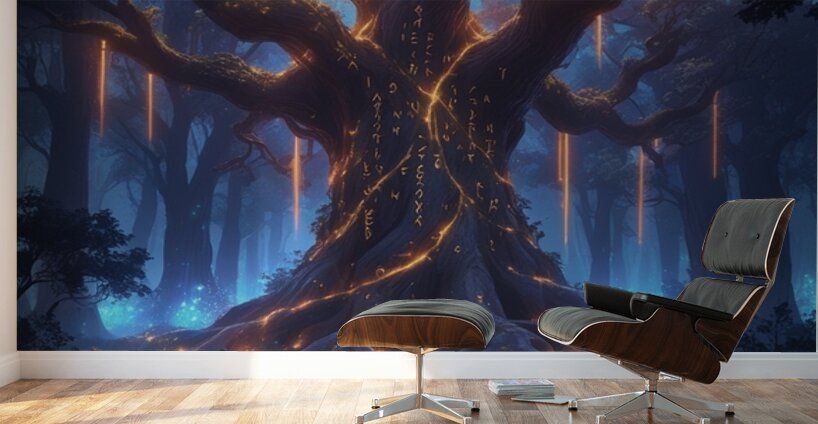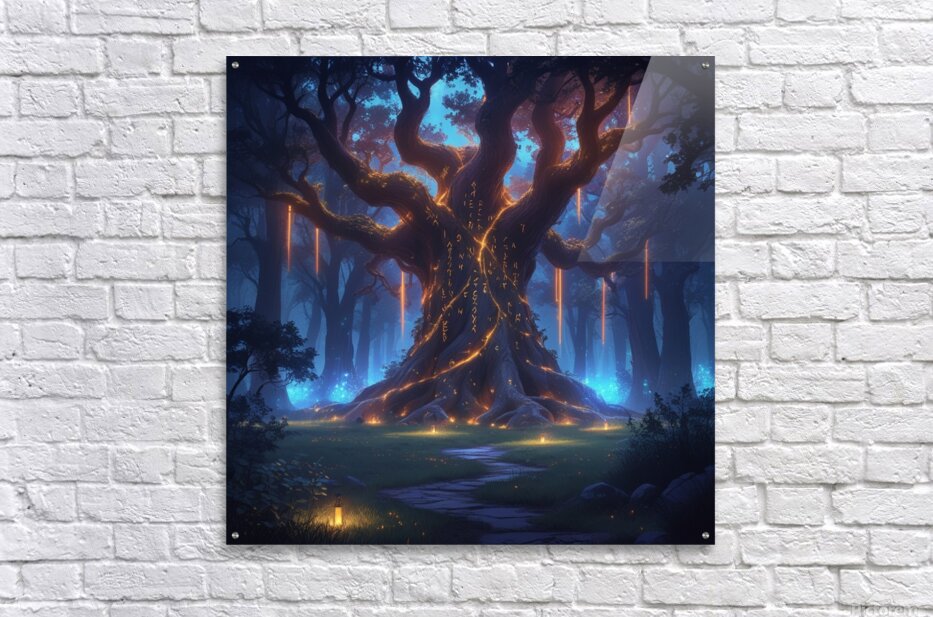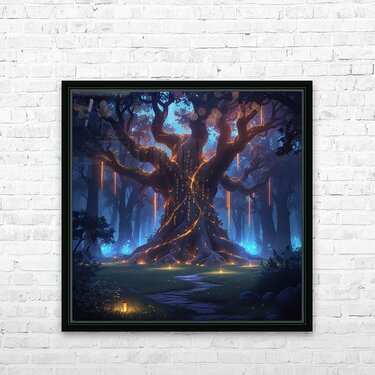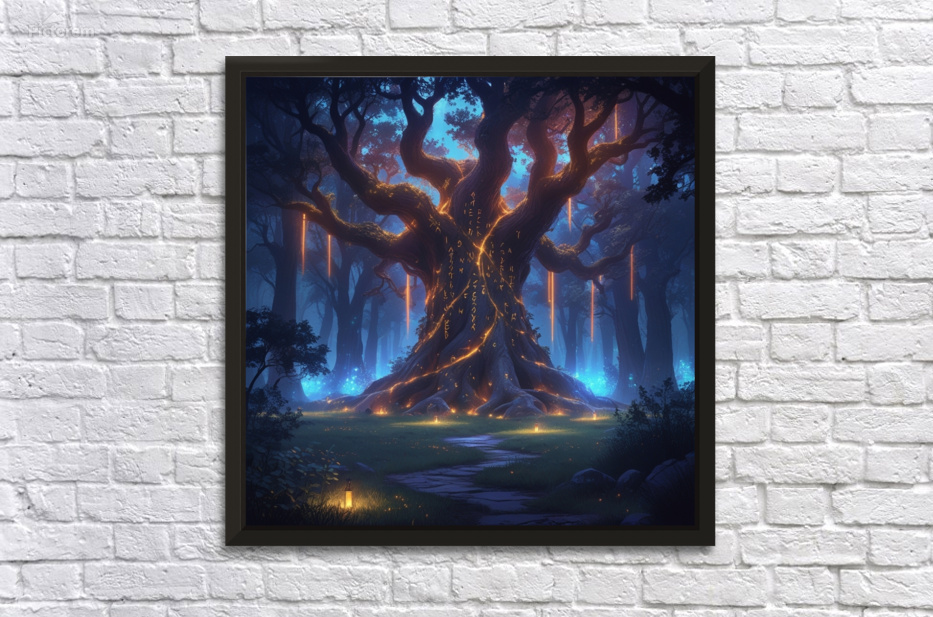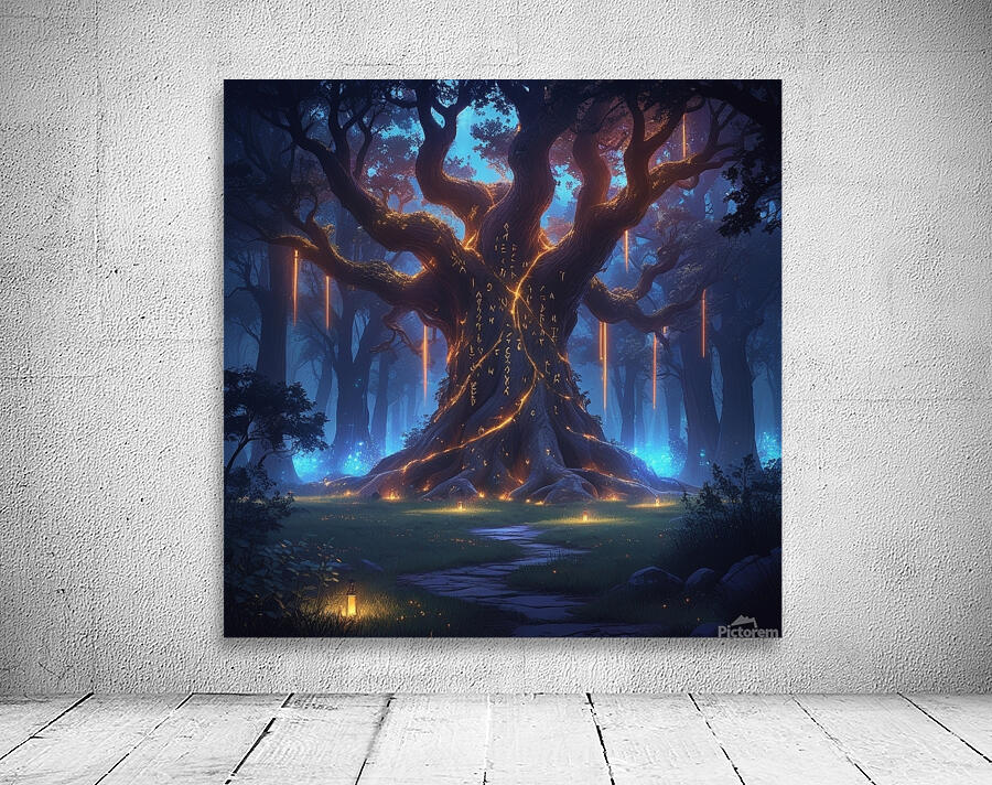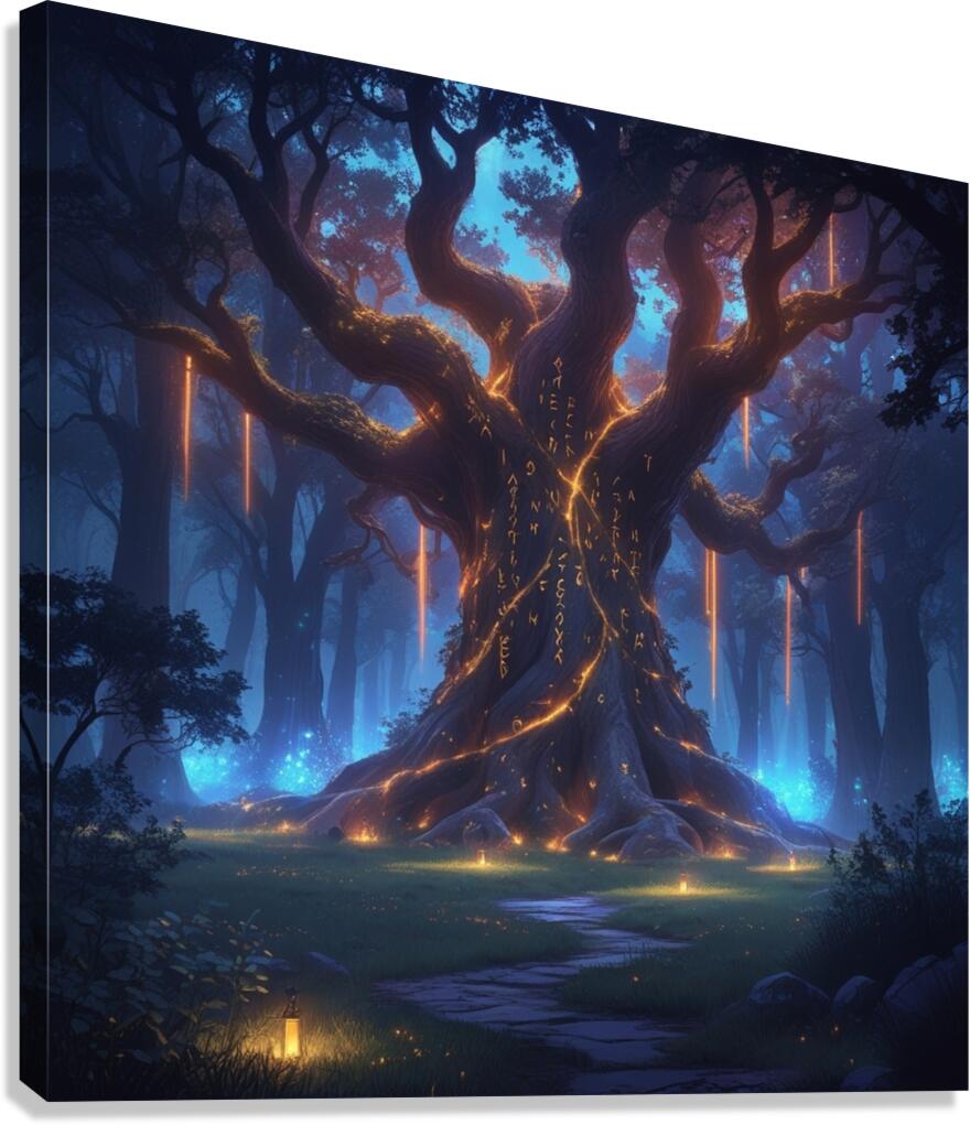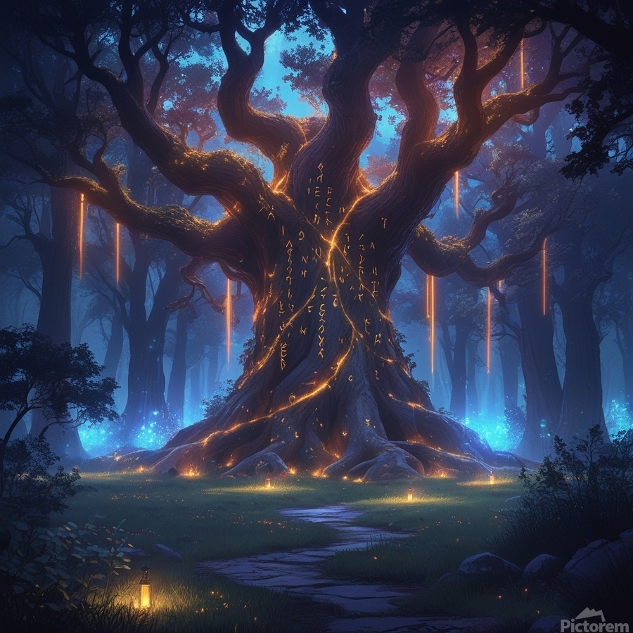 Epic fantasy digital illustration, enchanted forest glowing with magical lights, giant ancient tree with runes, mysterious atmosphere, cinematic lighting, ultra-detailed, vibrant colors, perfect for premium wall art, Displate trending fantasy style
