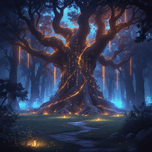 Epic fantasy digital illustration, enchanted forest glowing with magical lights, giant ancient tree with runes, mysterious atmosphere, cinematic light...[+]