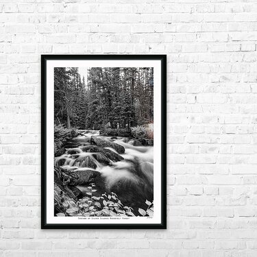 This black and white fine art print captures the tranquil flow of a mountain stream in Roosevelt National Forest transforming rushing water into a sil...[+]