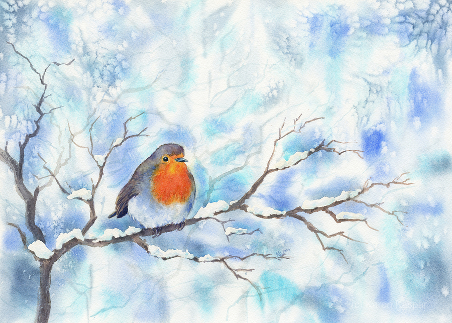 Robin in a winter landscape is a watercolor painting in landscape format hand-painted by the artist Karen Kaspar. A European Robin sits on a snow-covered branch in the middle of a gentle winter scene. The bright orange breast feathers form a striking contrast to the soft cool colours of the wintry background. Delicate twigs are lightly dusted with snow lending the scene a calm and frosty atmosphere. Soft blue and white tones fill the background and suggest a cold but calm atmosphere. More paintings with bird motifs can be found in my Collection of Bird paintings. The collection is constantly being expanded. So have a look from time to time. Fine art prints and home decor from original artwork, paintings and photography by artist Karen Kaspar. 651