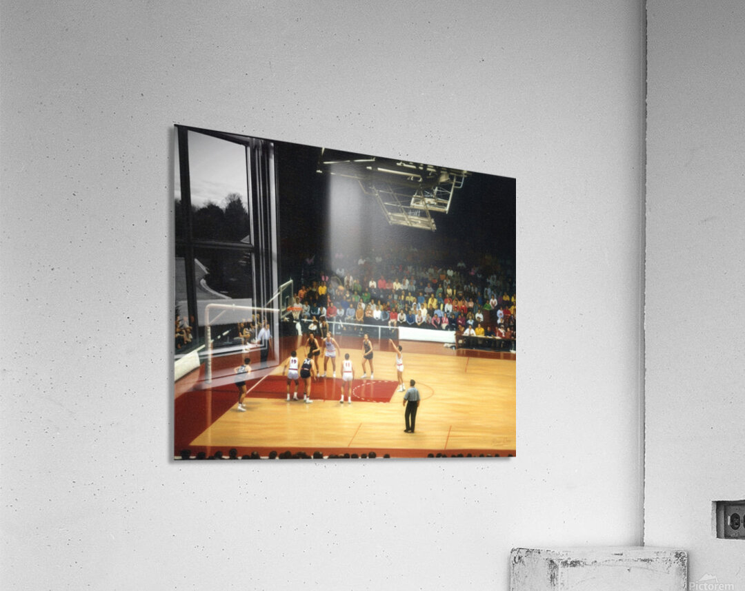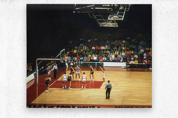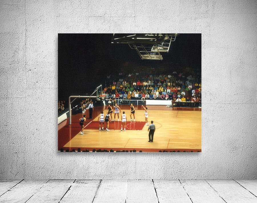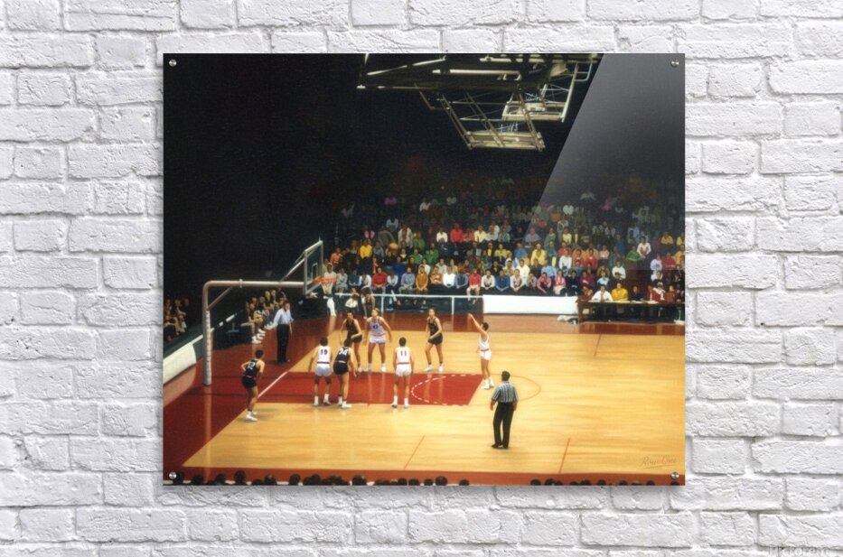 This 1950s Arkansas Razorbacks basketball art shows a free throw attempt by the Hogs. This awesome mixed media painting is a piece of college hoops history that will look terrific in your home or office. Derivative art © 2025 Row One Brand