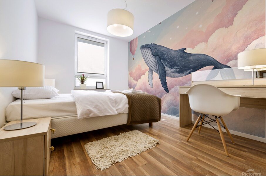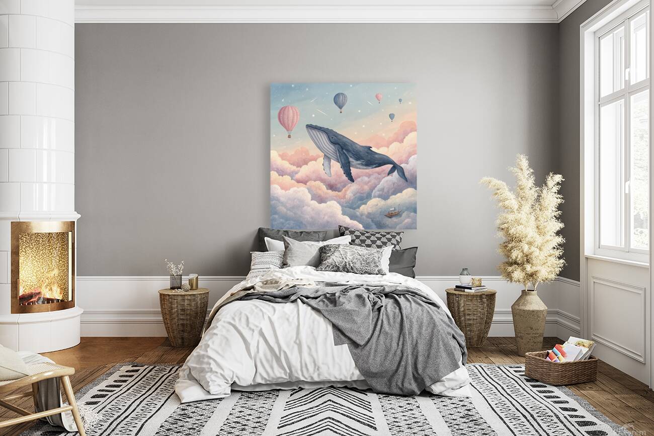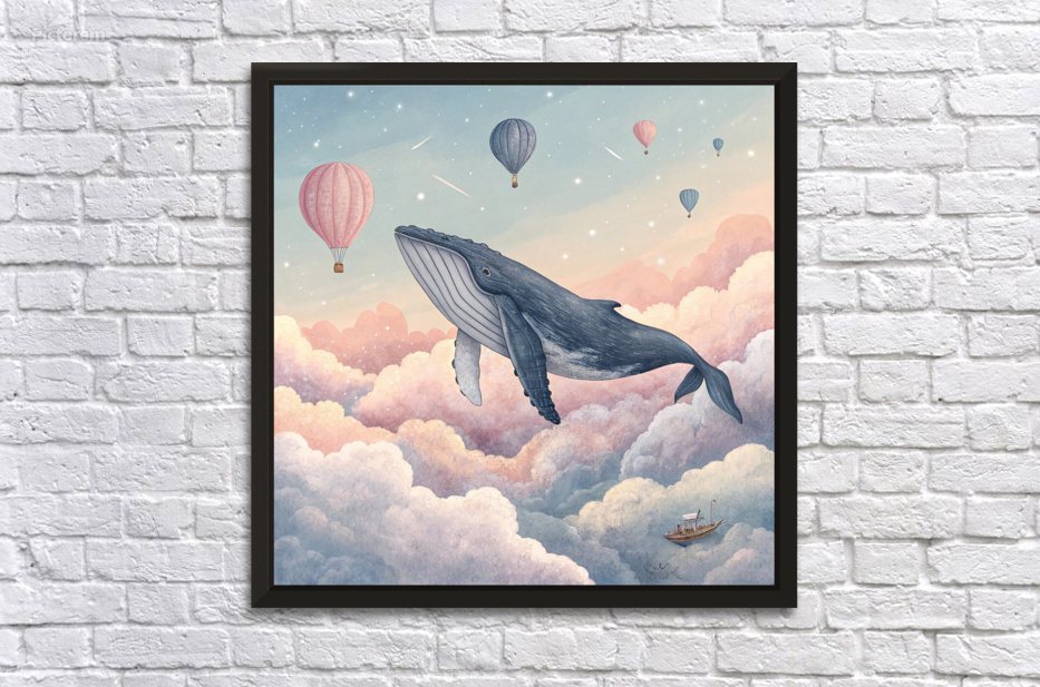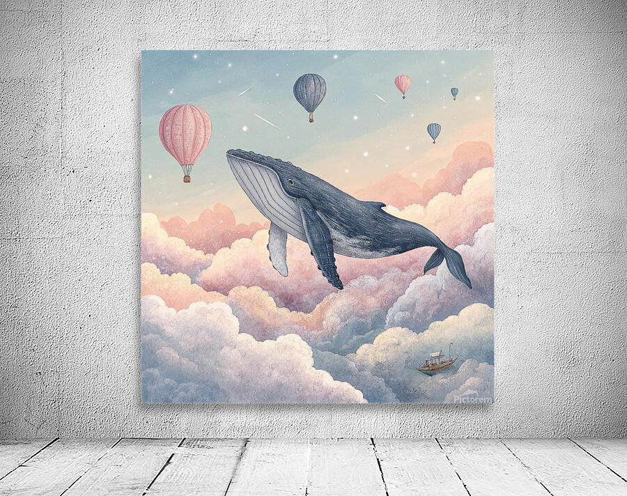 A surreal painting that captures the imagination! A humpback whale swimming through a dawn sky adorned with pastel clouds, rendered in a sophisticated digital watercolor style. A dreamy and comforting art piece, perfect for the bedroom, nursery, or any space seeking to evoke wonder and awe. Superb fine art print quality highlights the watercolor texture.