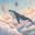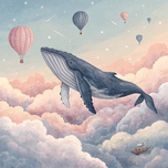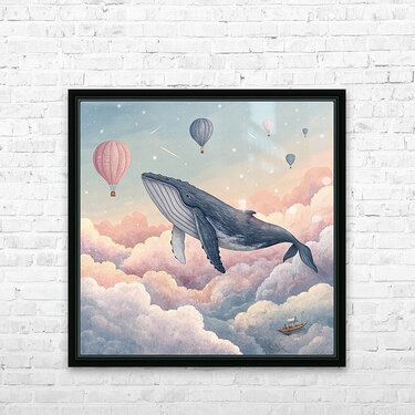 A surreal painting that captures the imagination! A humpback whale swimming through a dawn sky adorned with pastel clouds, rendered in a sophisticated...[+]