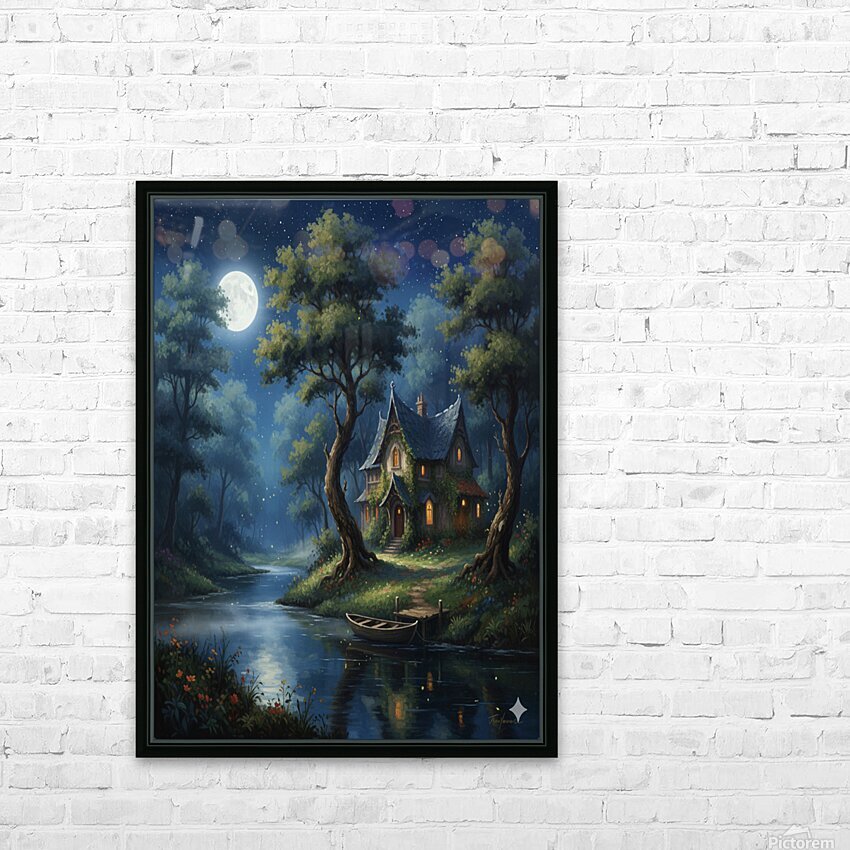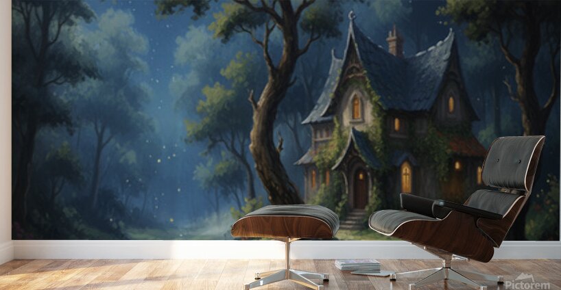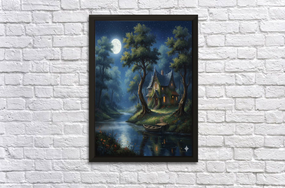 The image depicts a magical fantasy scene featuring the following elements: Charming countryside house: A rustic, fairytale-style house on the bank o...[+]