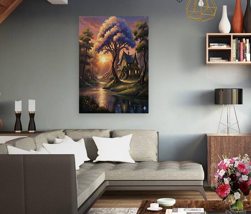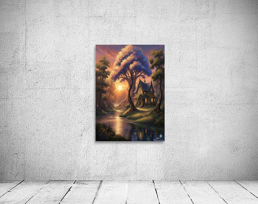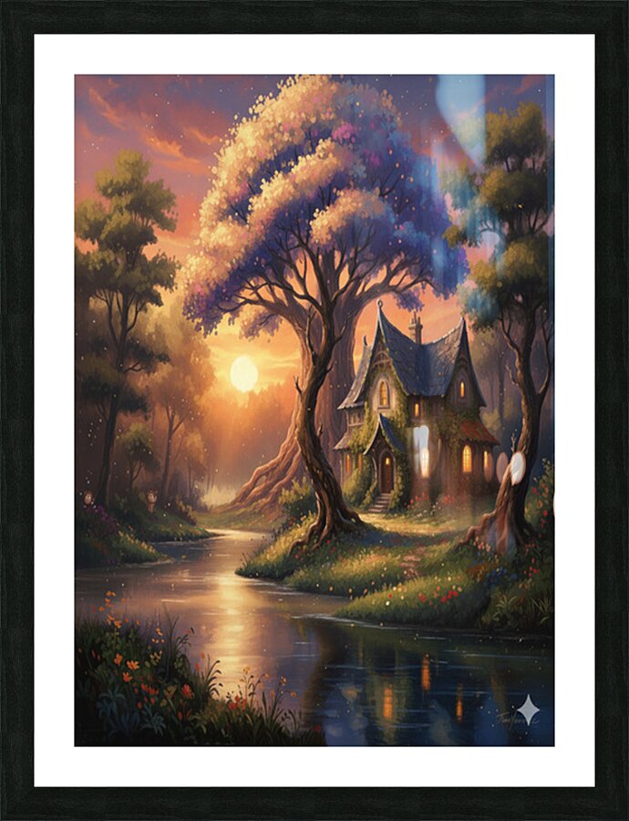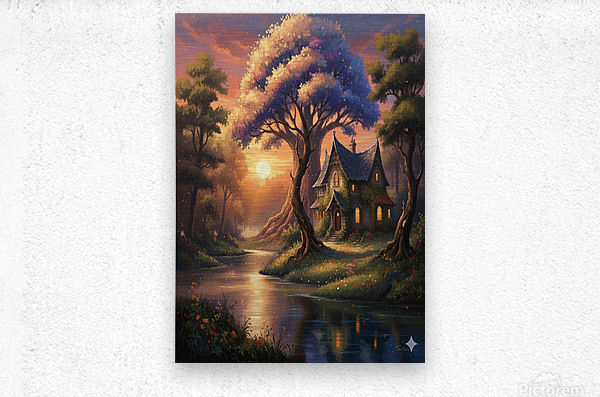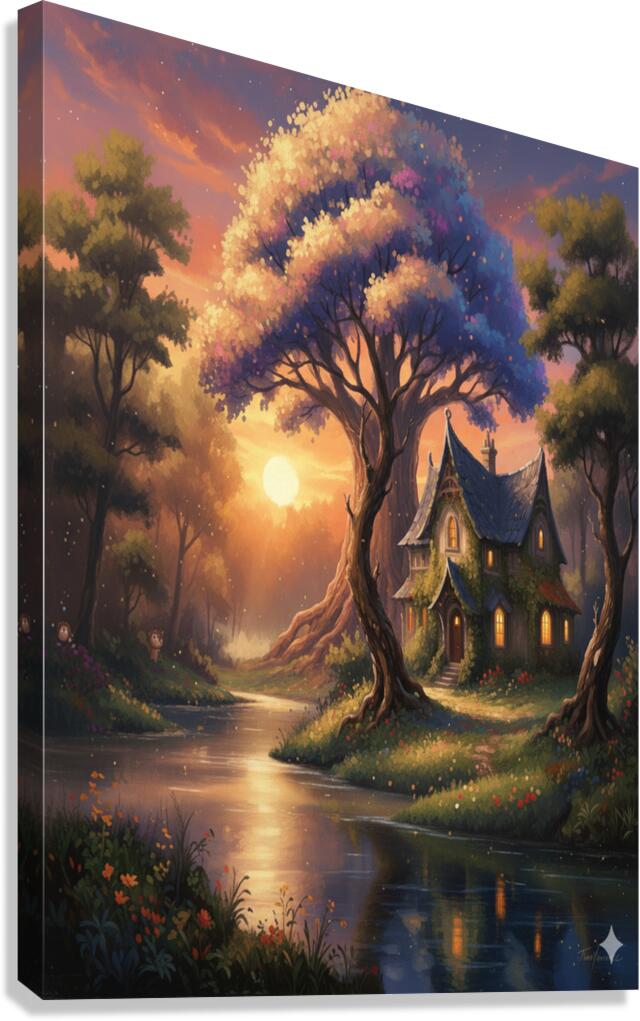 English Translation: The image depicts a magical fantasy scene featuring the following elements: Charming countryside house: A rustic, fairytale-style house on the bank of a river or lake, with pointed roofs, glowing windows, and covered in climbing greenery. Glowing giant tree: A massive tree with leaves glowing in shades of violet and gold, dominating the scene beside the house and serving as the focal point. Calm river or lake: A tranquil waterway reflecting the colors of the sky and sun, with a small boat anchored on the shore. Enchanting sunset: Warm orange hues of the sky indicate the time of sunset, with radiant sunlight casting its glow over the landscape. Lush natural surroundings: Verdant greenery and wildflowers surround the house and waterway, adding
