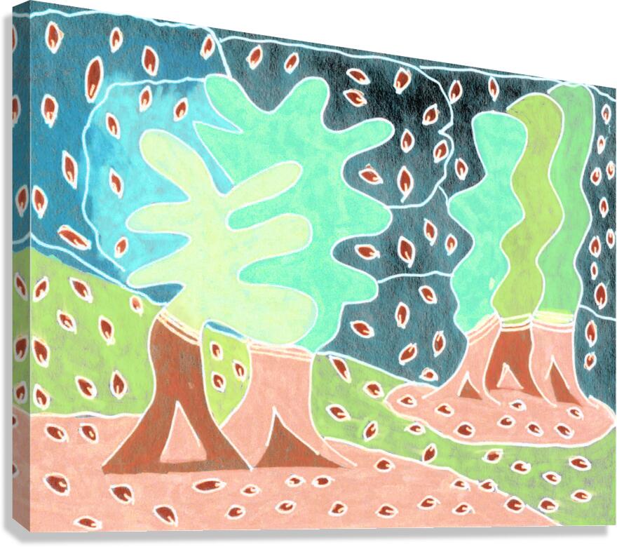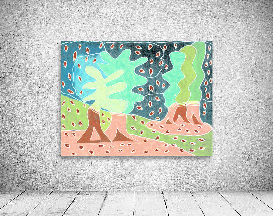 I originally hand drawn this design from imagination using coloured ink pens and paper, laterally colour digitally editing it to create this stunning piece of contemporary art. Features colorful, abstract trees in a forest. Leaves are scattered across the scene, creating a sense of movement.