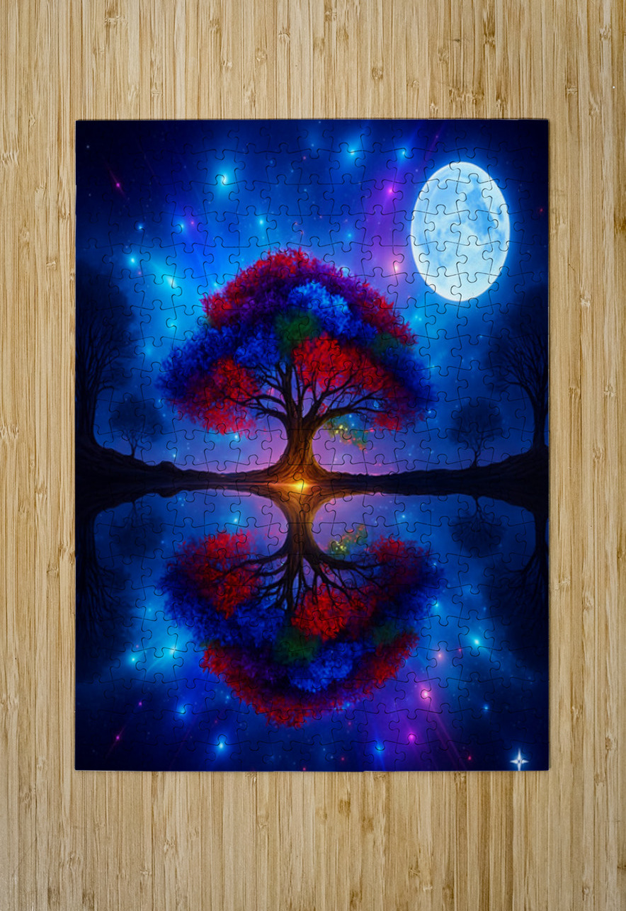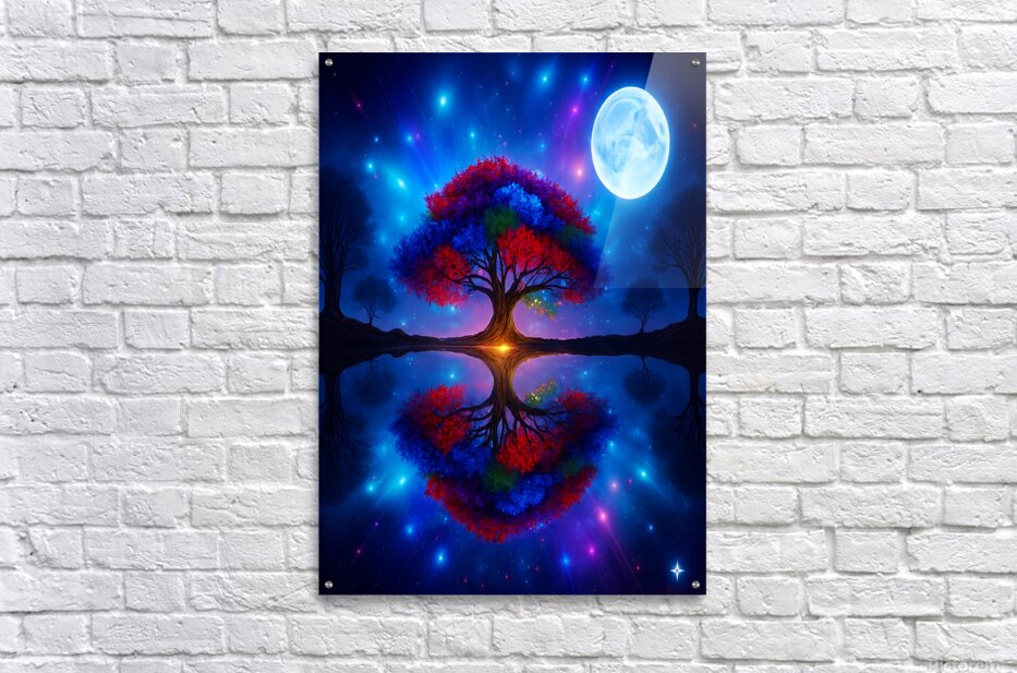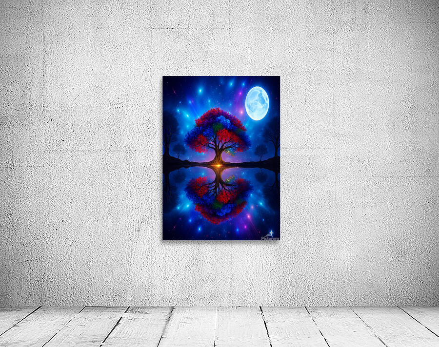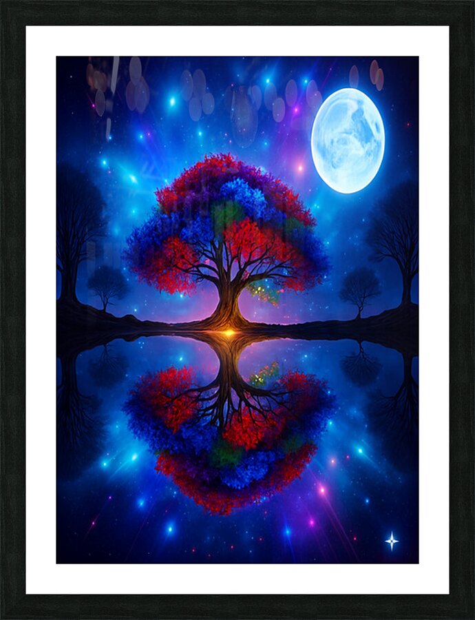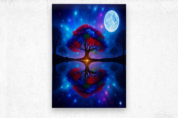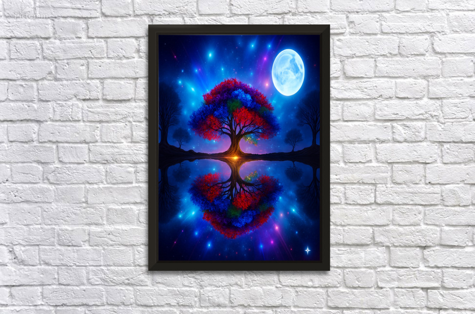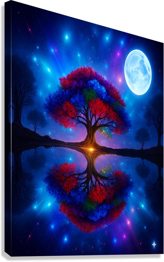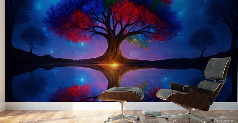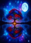 The image showcases a large, radiant tree with multicolored leaves—shades of red, orange, blue, and purple. It's dramatically backlit by a glowing light source, possibly a sunset or a mystical energy, which enhances the brilliance of the foliage. ???? Perfect Reflection Beneath the tree lies a calm, mirror-like body of water that reflects the tree with stunning symmetry, creating a dreamlike visual balance. ???? Framing Forest Surrounding the central tree is a dense forest of tall, dark green coniferous trees, forming a natural frame that draws the eye inward. ???? Celestial Sky Above, the sky bursts with stars, nebulae, and cosmic light formations in deep blues, purples, and fiery oranges—suggesting a surreal or otherworldly realm. ? Atmosphere & Symbolism The image blends nature and the cosmos in a way that feels symbolic—perhaps representing life, energy, or the deep connection between Earth and the universe. Its use of vivid color, symmetry, and fantastical elements evokes awe and wonder, like a portal to a magical world.