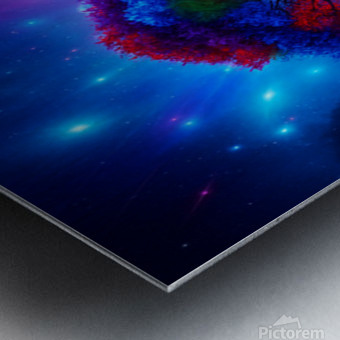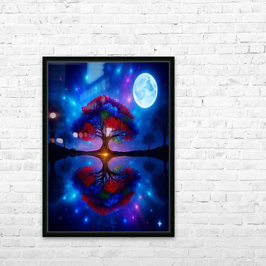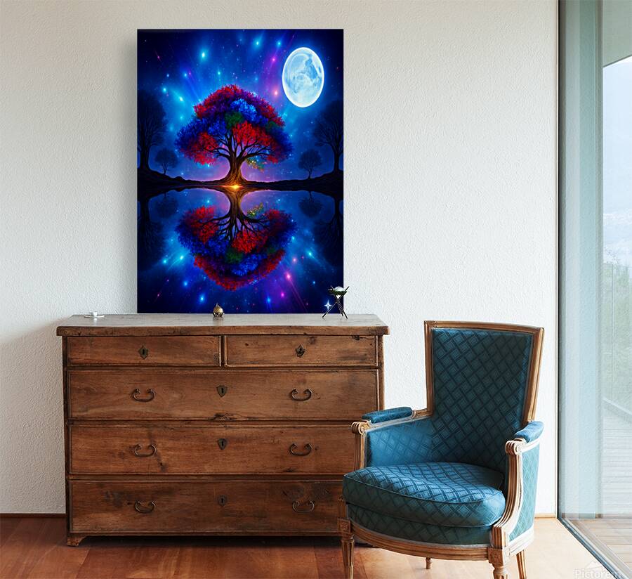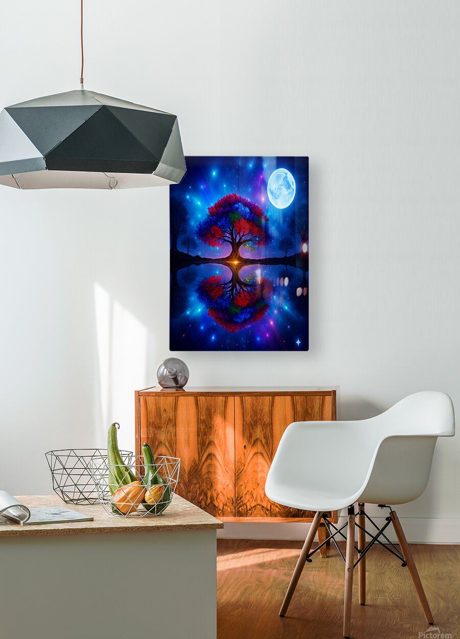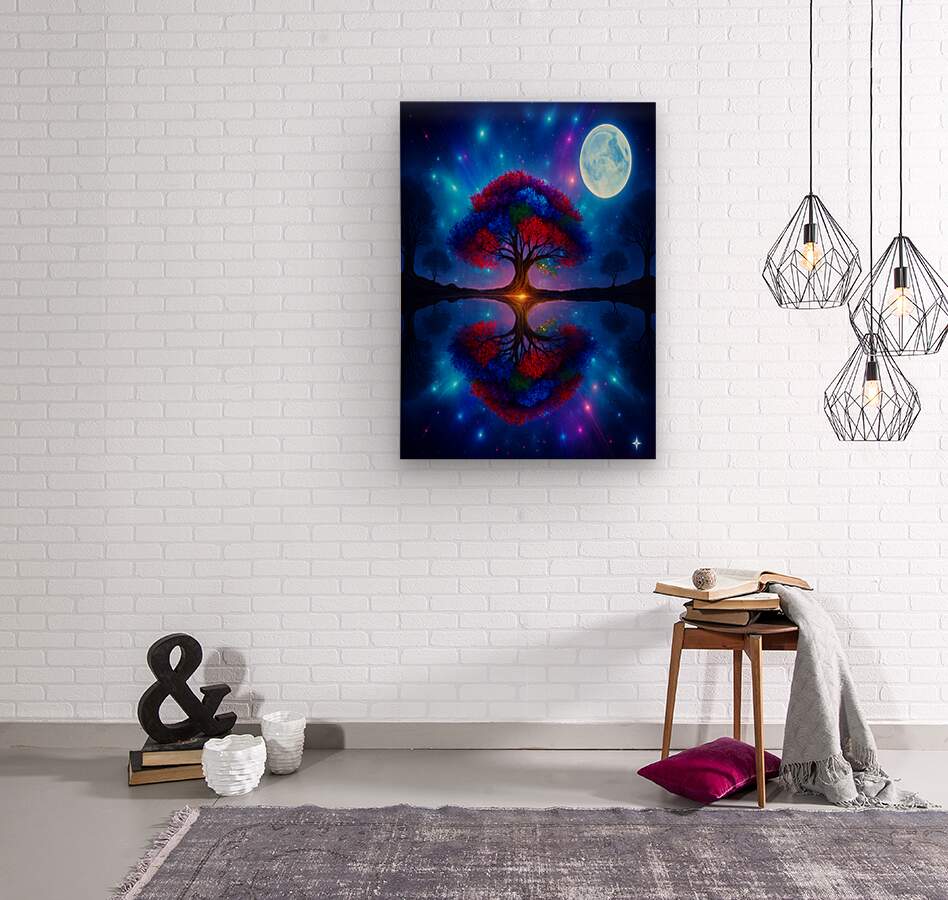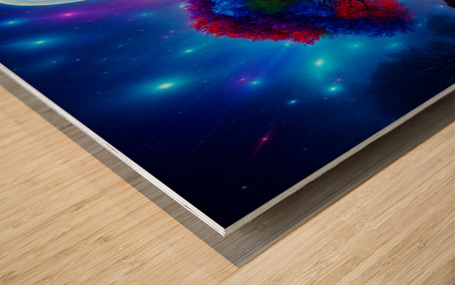 The image showcases a large, radiant tree with multicolored leaves—shades of red, orange, blue, and purple. It's dramatically backlit by a glowing light source, possibly a sunset or a mystical energy, which enhances the brilliance of the foliage. ???? Perfect Reflection Beneath the tree lies a calm, mirror-like body of water that reflects the tree with stunning symmetry, creating a dreamlike visual balance. ???? Framing Forest Surrounding the central tree is a dense forest of tall, dark green coniferous trees, forming a natural frame that draws the eye inward. ???? Celestial Sky Above, the sky bursts with stars, nebulae, and cosmic light formations in deep blues, purples, and fiery oranges—suggesting a surreal or otherworldly realm. ? Atmosphere & Symbolism The image blends nature and the cosmos in a way that feels symbolic—perhaps representing life, energy, or the deep connection between Earth and the universe. Its use of vivid color, symmetry, and fantastical elements evokes awe and wonder, like a portal to a magical world.