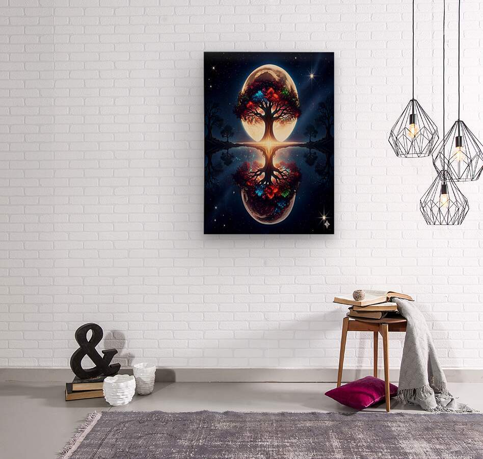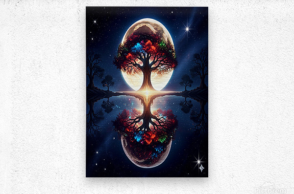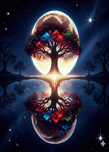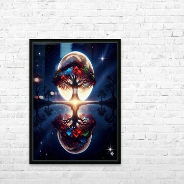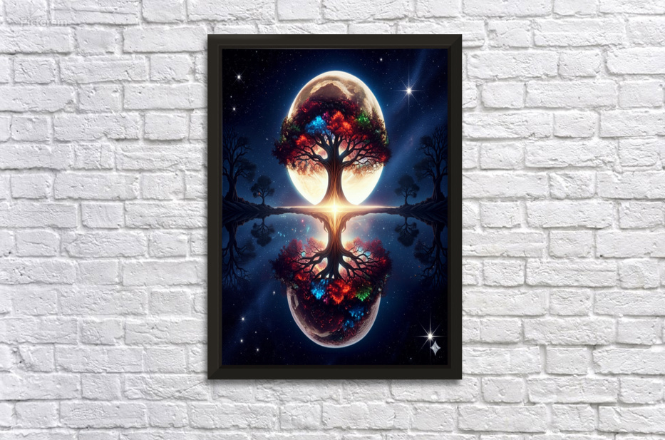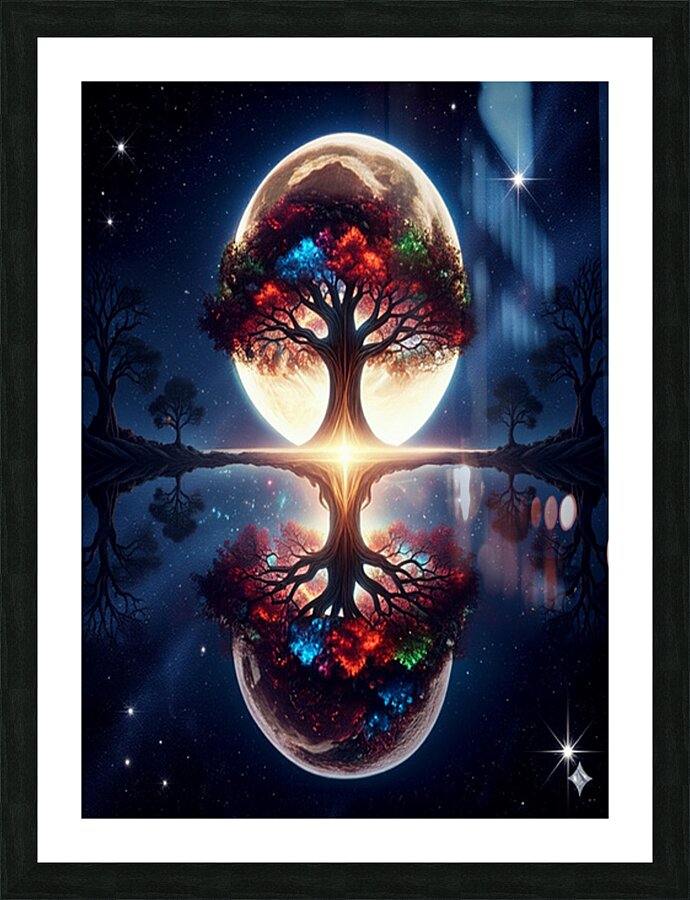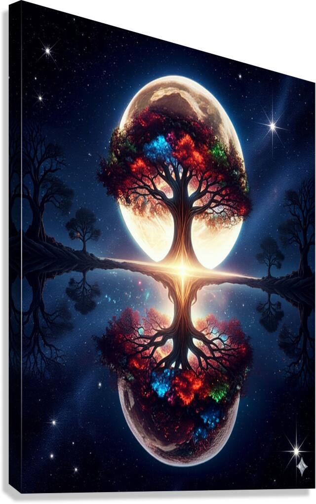 "The Tree of Life embraces the moon beneath an inspiring cosmic sky, where Earth meets space in a mythical scene."