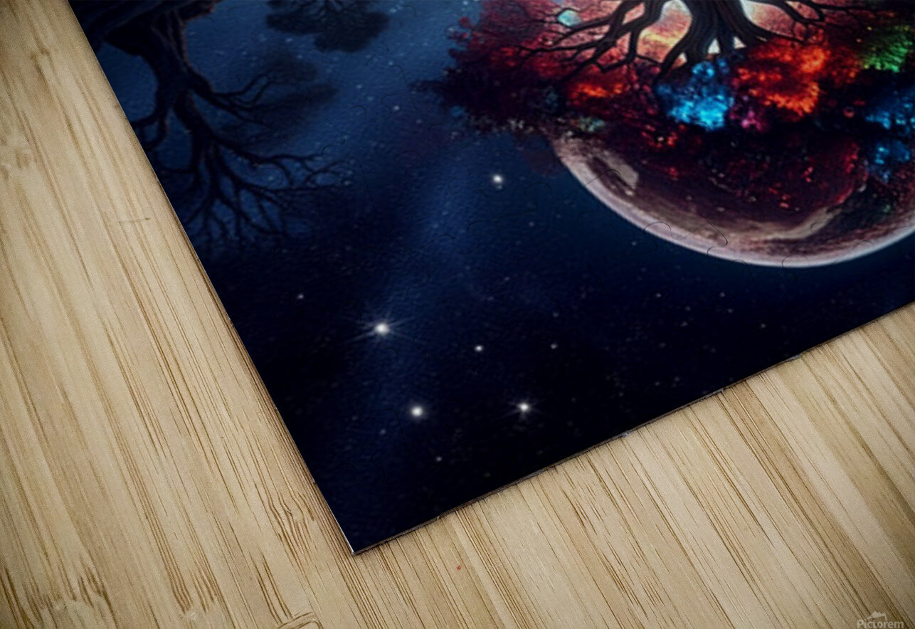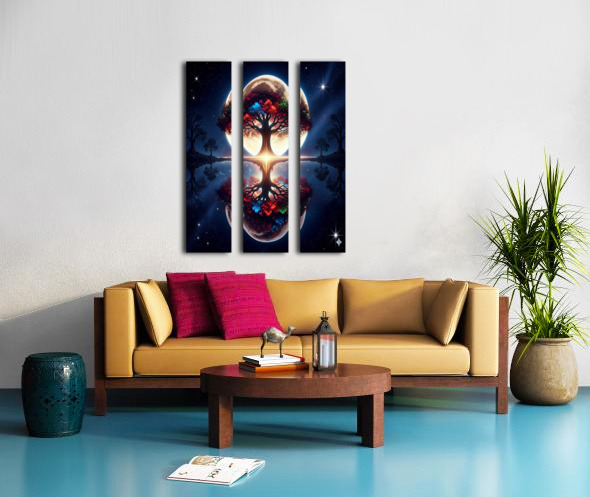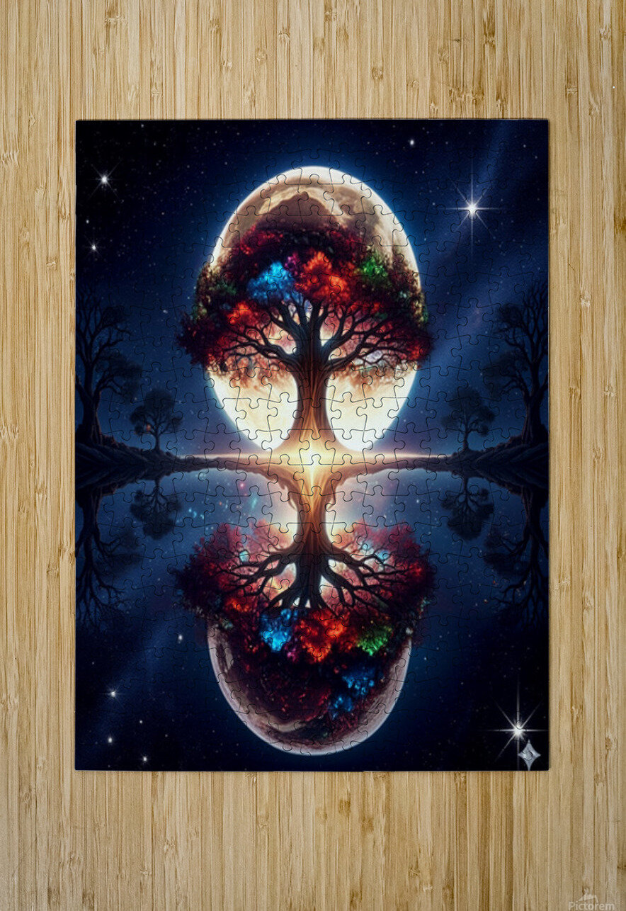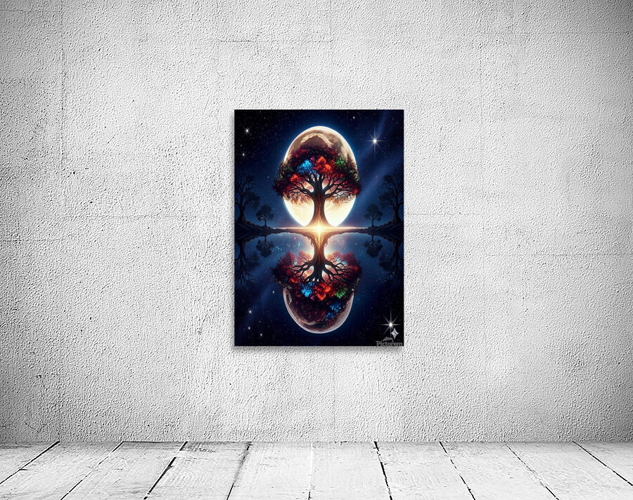 "The Tree of Life embraces the moon beneath an inspiring cosmic sky, where Earth meets space in a mythical scene."