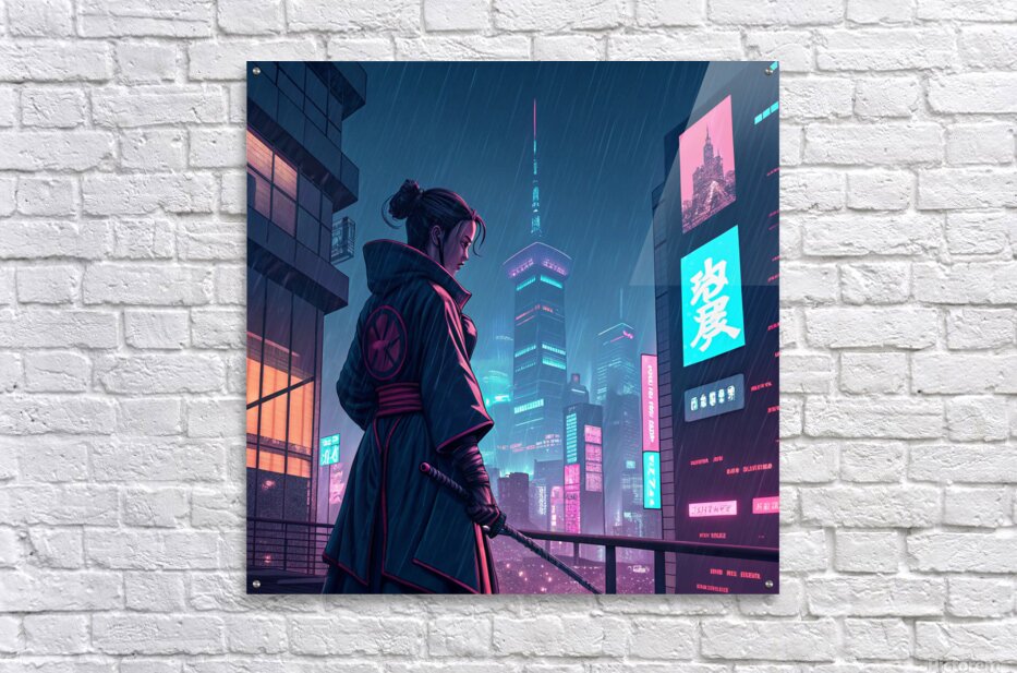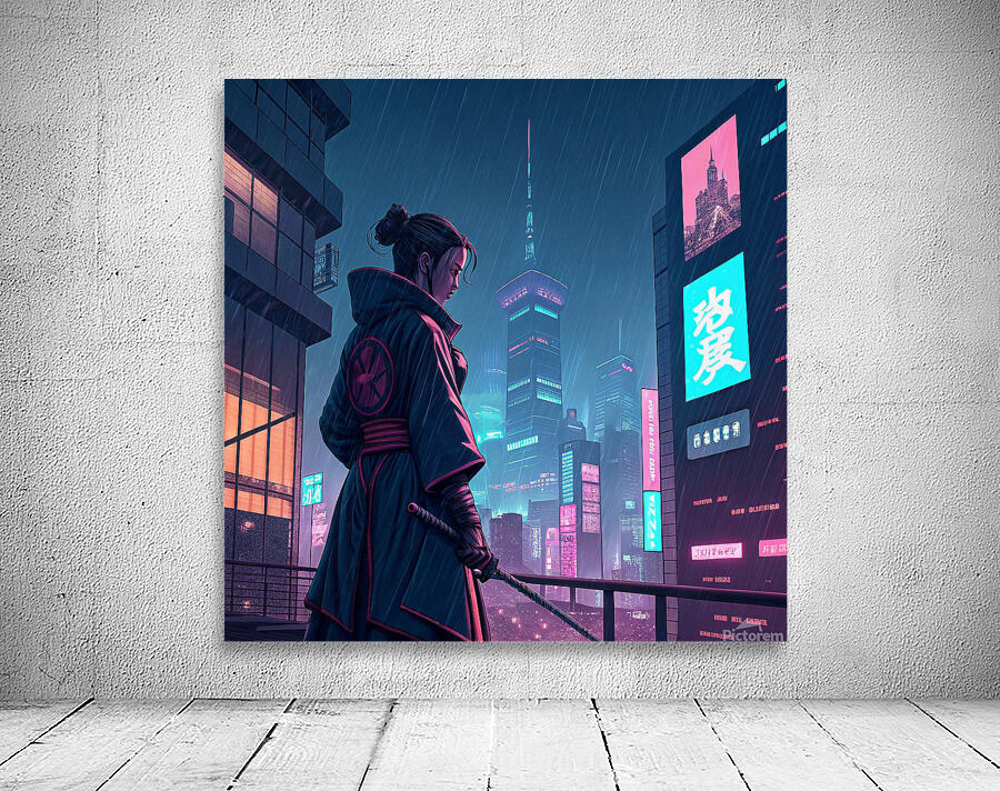 ABOUT THIS ARTWORK: NEON SAMURAI ON A RAINY TOKYO ROOFTOP