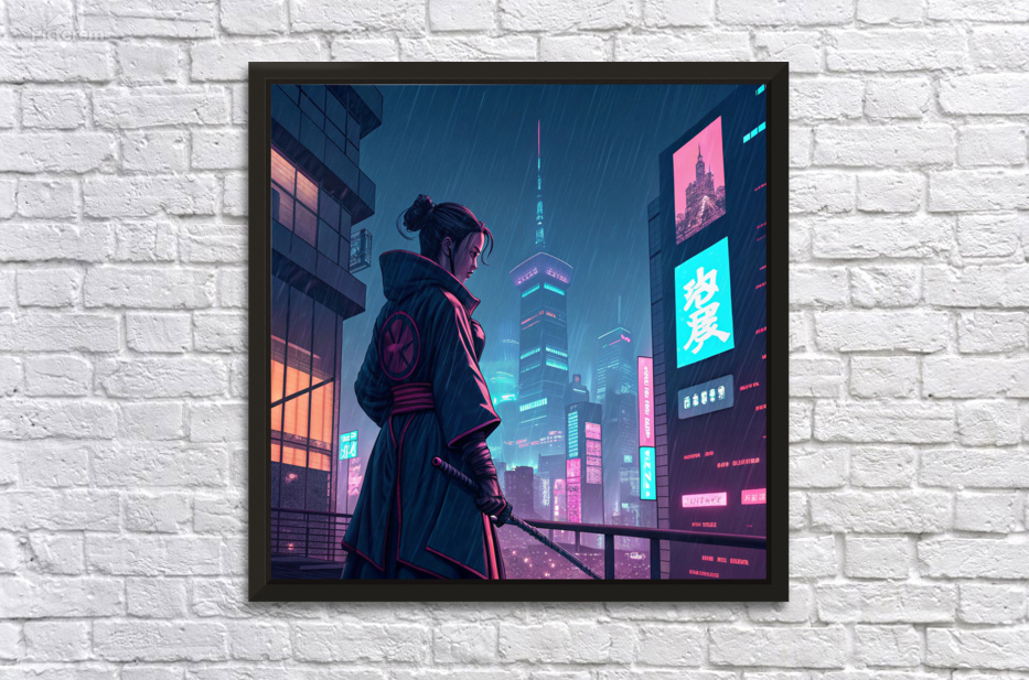 Neon Samurai on a Rainy Tokyo Rooftop Frame print