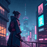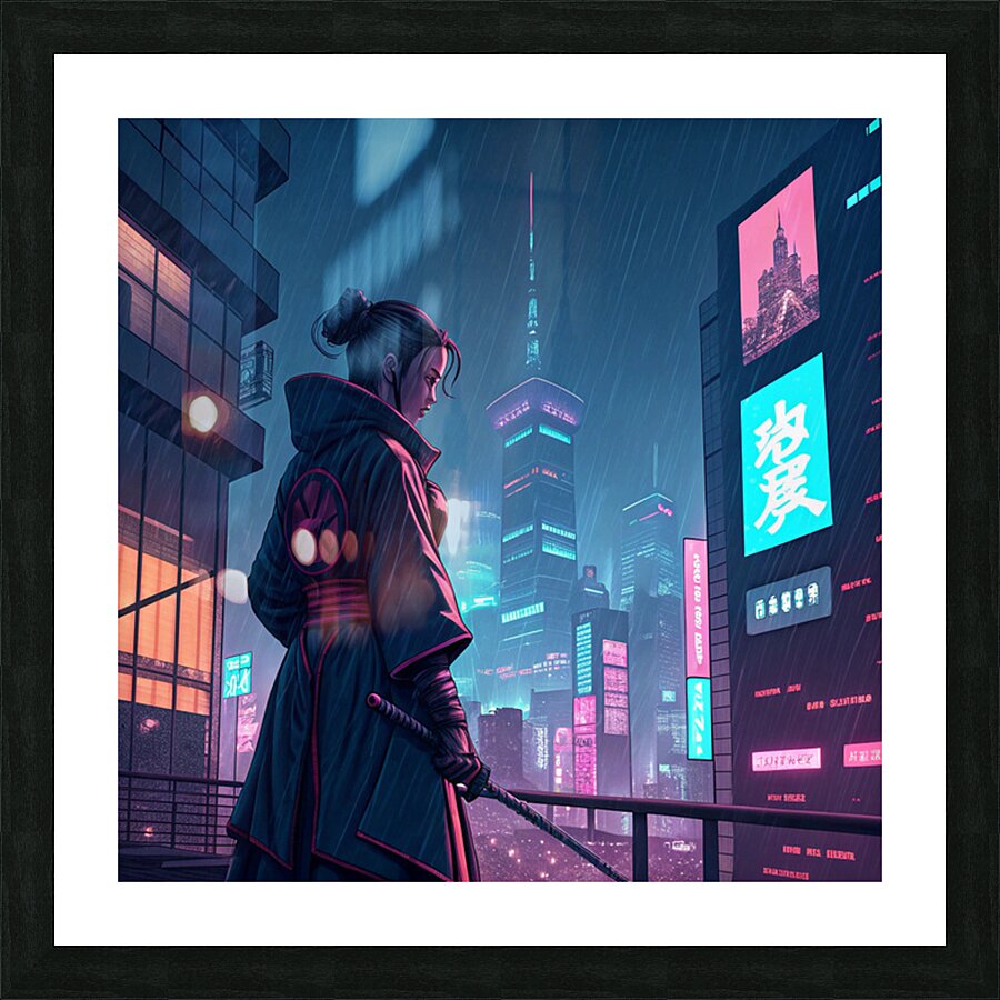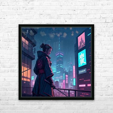 Get this artwork "Neon Samurai on a Rainy Tokyo Rooftop" in a framed print.