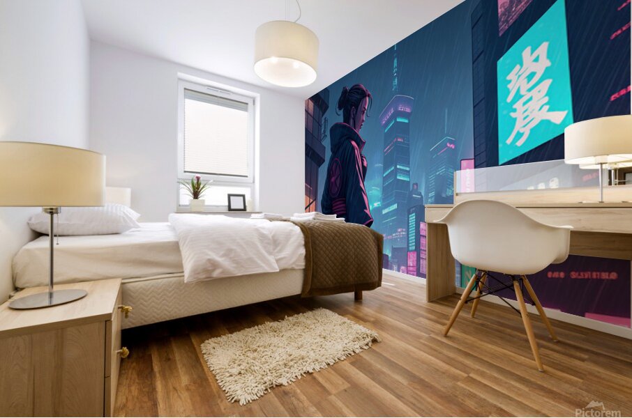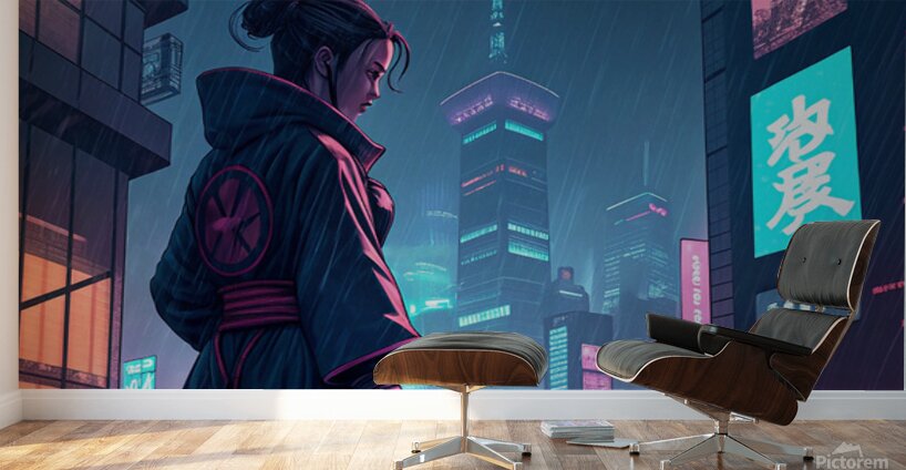 An intensely detailed and atmospheric Cyberpunk Anime illustration. It captures a lone samurai overlooking a rain-soaked, neon-drenched Tokyo skyline. The deep purples and electric blues create a powerful, cinematic mood. Perfect for gaming rooms, modern apartments, or anyone who loves high-impact, futuristic art. Looks incredible on a Metal or Acrylic print.