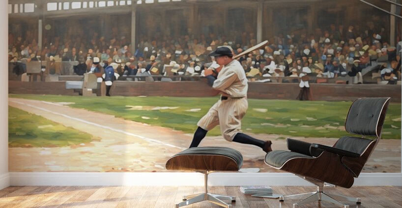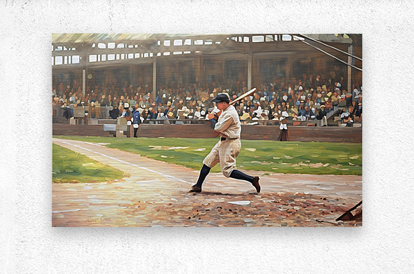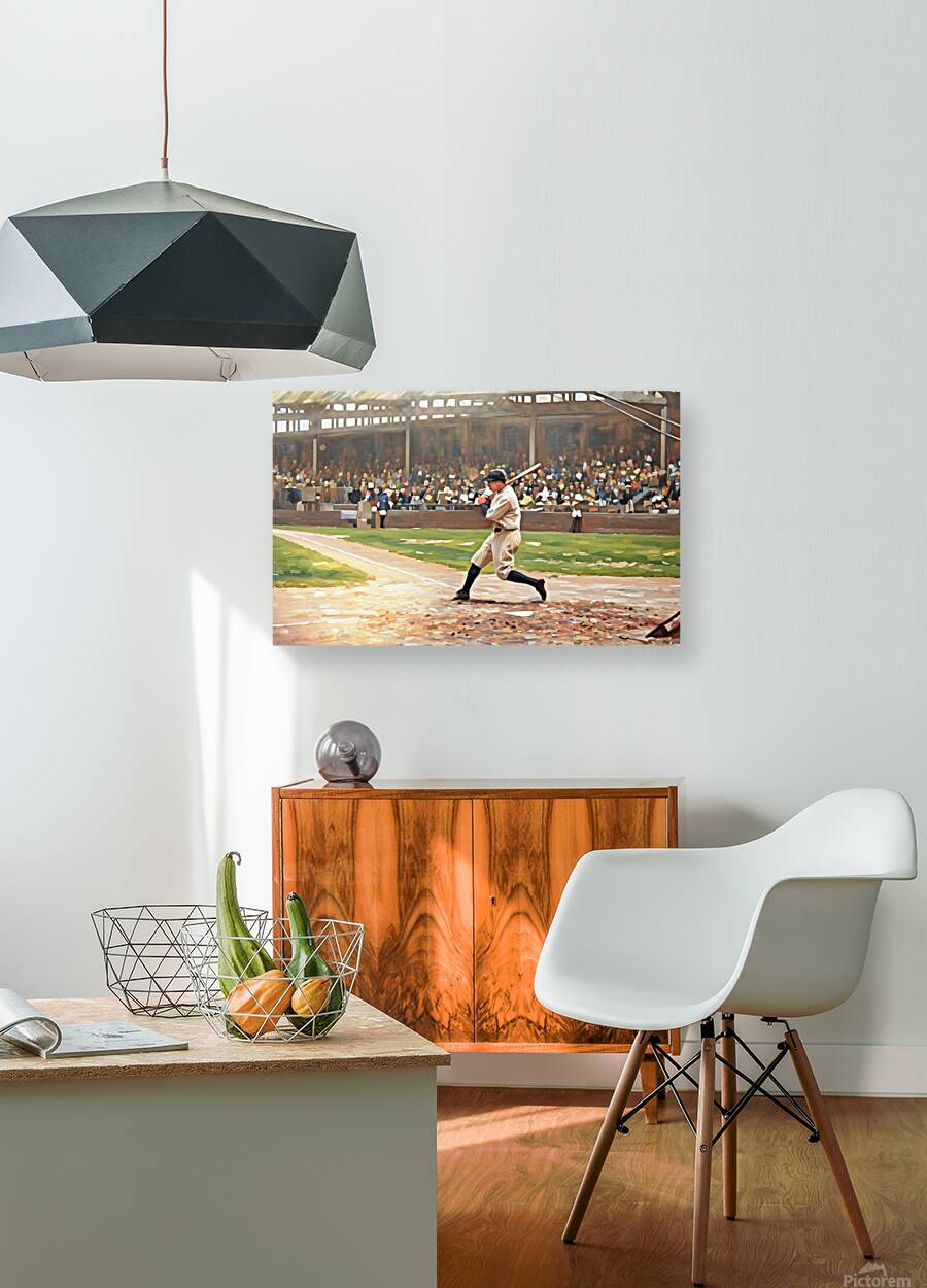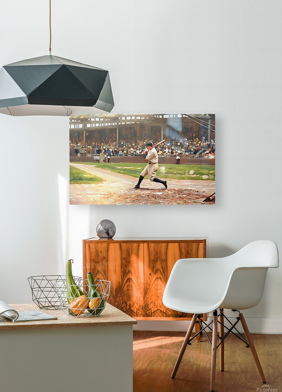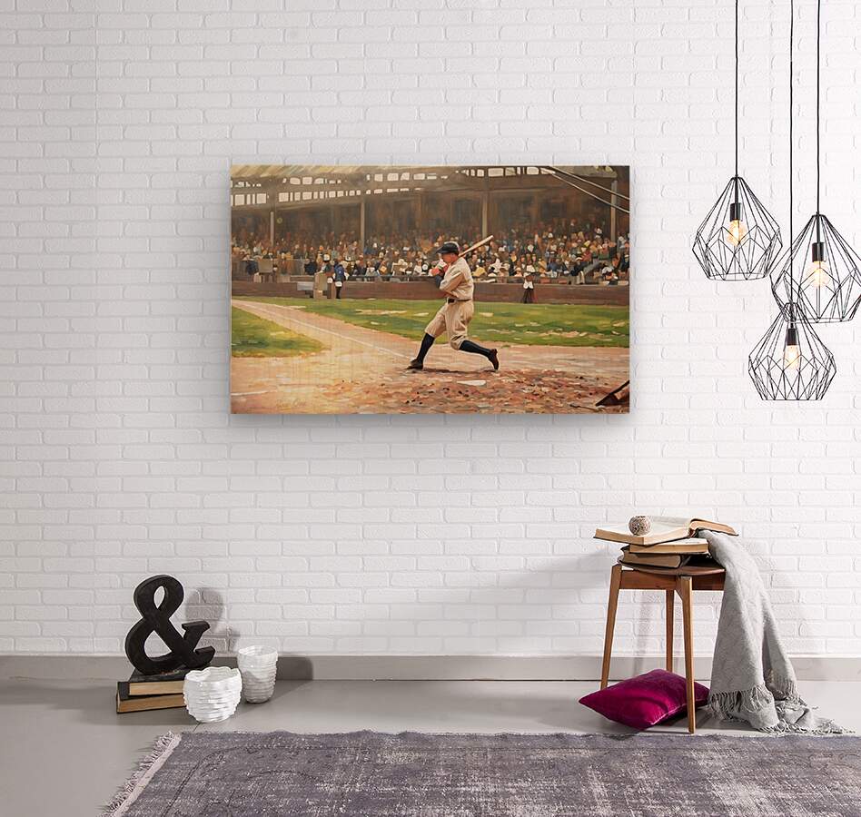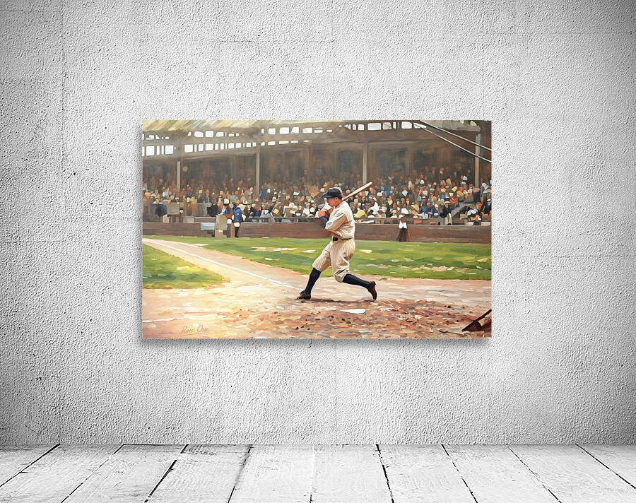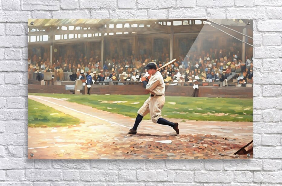 In this Row One Brand mixed media painting, baseball legend Babe Ruth is at the plate. This beautiful art is a true piece of baseball history. Derivative art © 2025 Row One Brand
