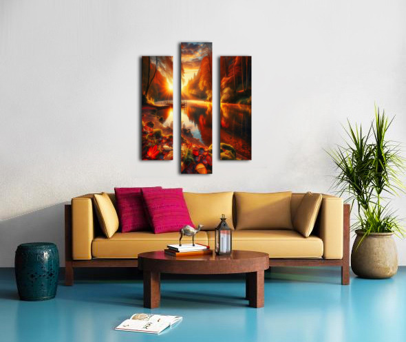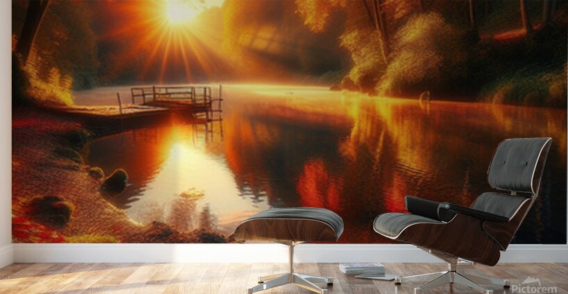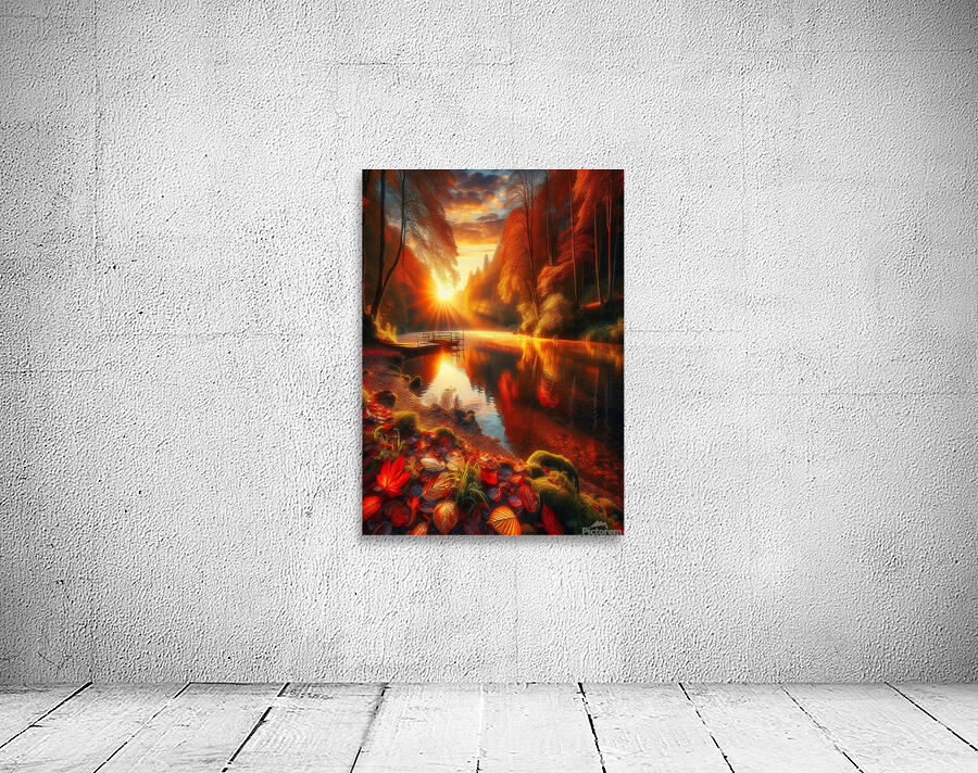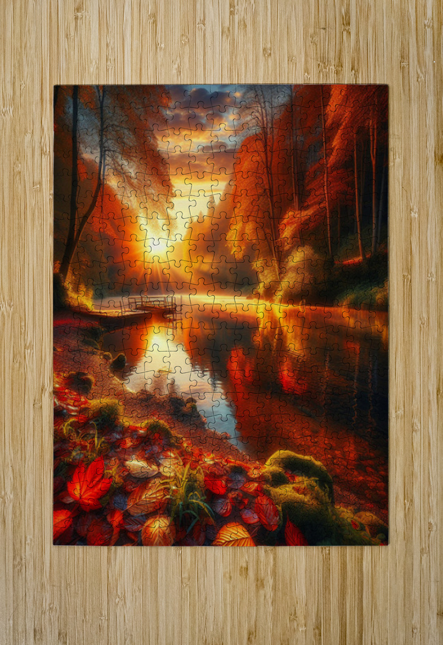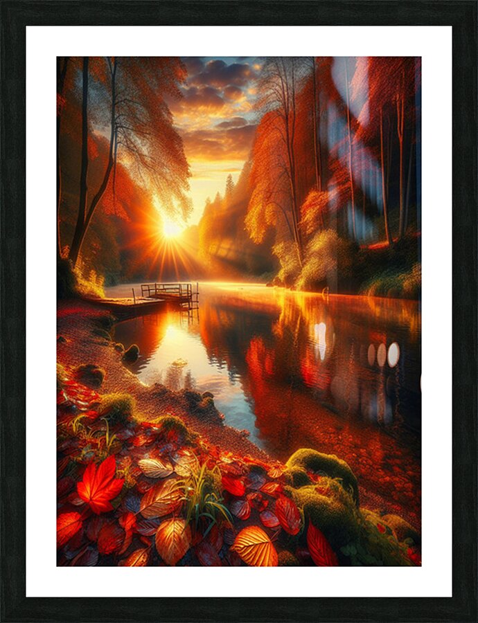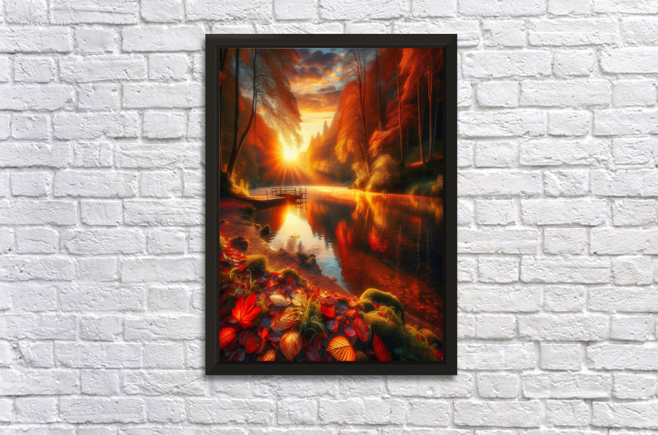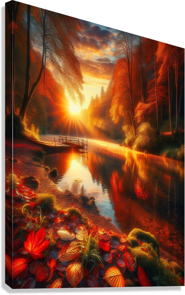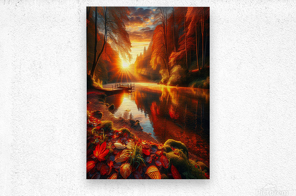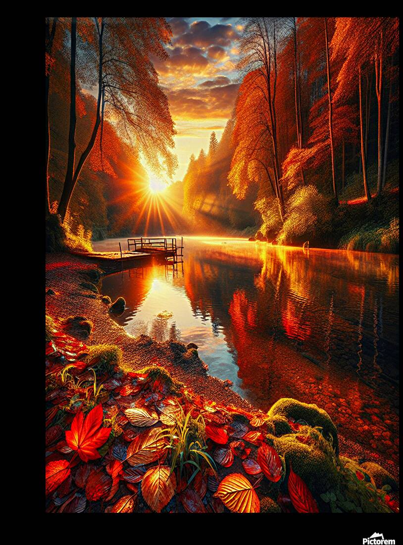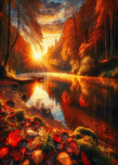 The image depicts a serene autumn landscape with a river reflecting the warm colors of the sunset. Trees with vibrant orange and red leaves line the r...[+]