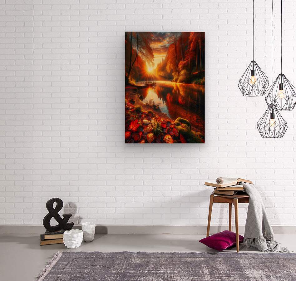 The image depicts a serene autumn landscape with a river reflecting the warm colors of the sunset. Trees with vibrant orange and red leaves line the riverbanks, creating a colorful forest scene. A small wooden dock extends into the water. The ground is covered with fallen leaves and mossy rocks.