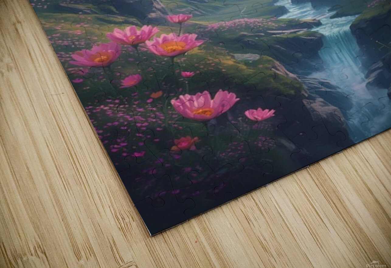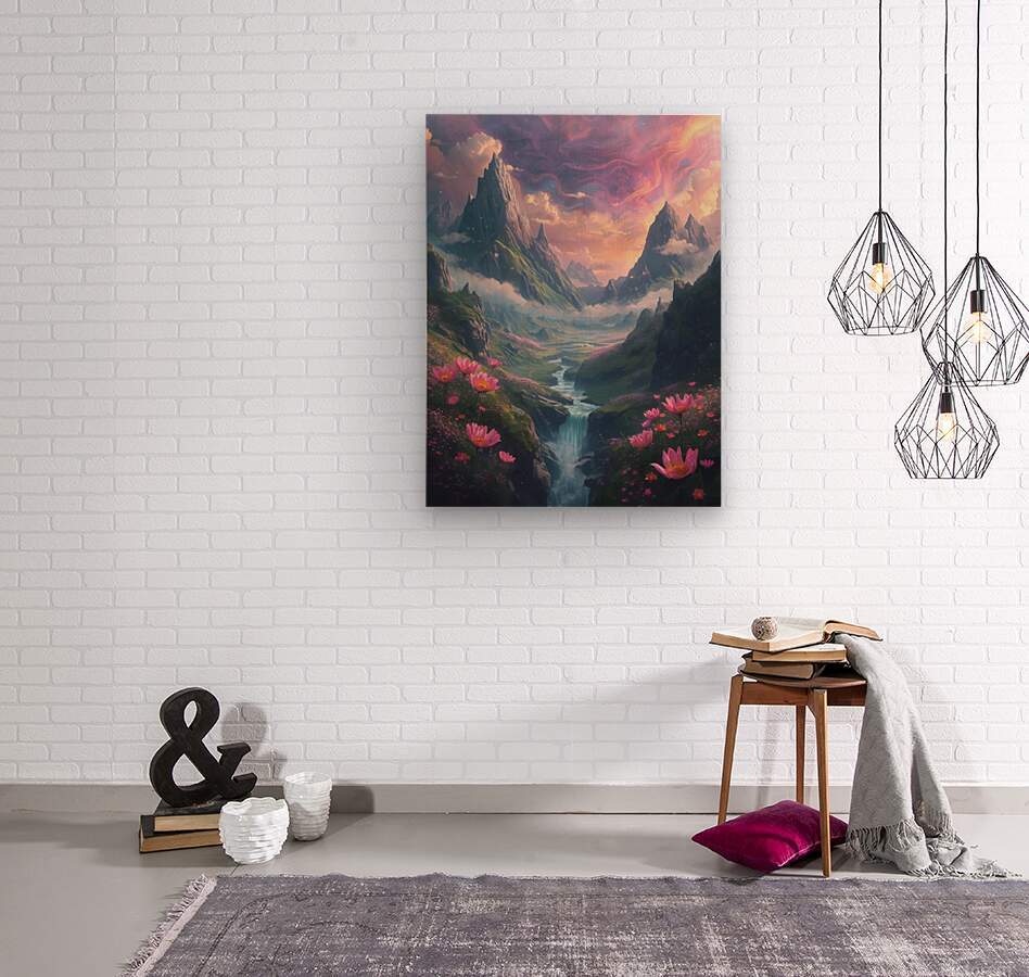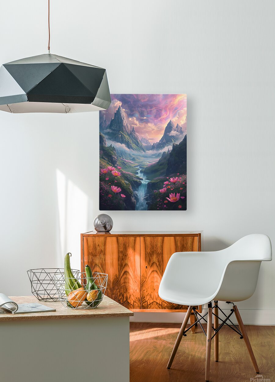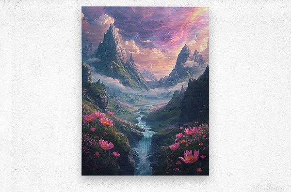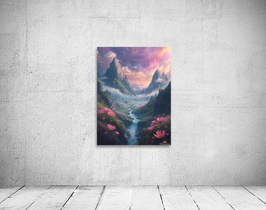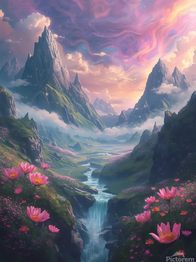 Escape into a world of wonder with this breathtaking, surreal mountain landscape. Towering peaks, glowing twilight skies, vibrant pink wildflowers, and cascading waterfalls create a dreamlike scene full of peace and mystery. This artwork brings a magical atmosphere to any space — perfect for nature lovers, fantasy art collectors, or anyone looking to add a calming and inspirational touch to their home or office. Makes a thoughtful and unique gift for someone special.