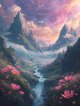Escape into a world of wonder with this breathtaking, surreal mountain landscape. Towering peaks, glowing twilight skies, vibrant pink wildflowers, an...[+]