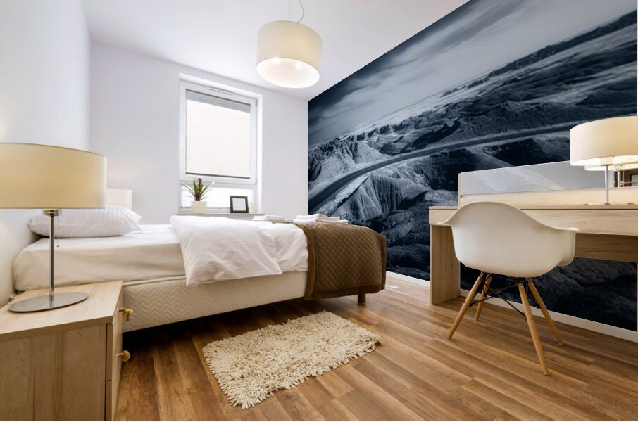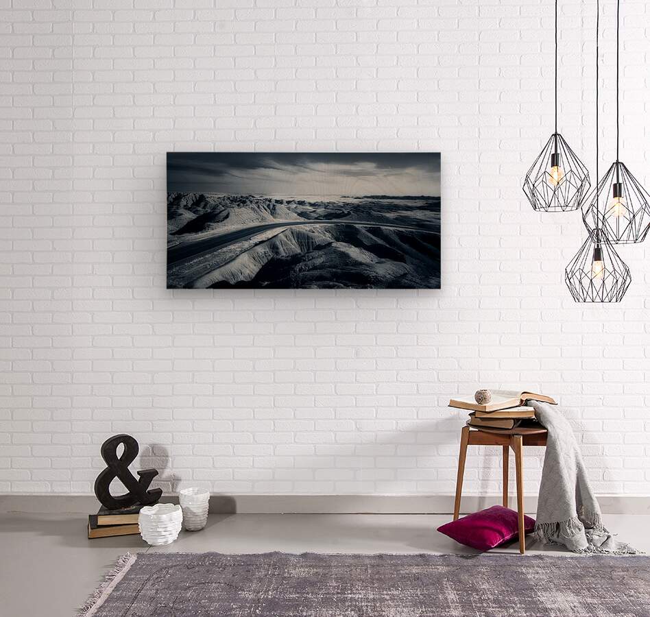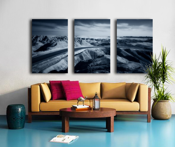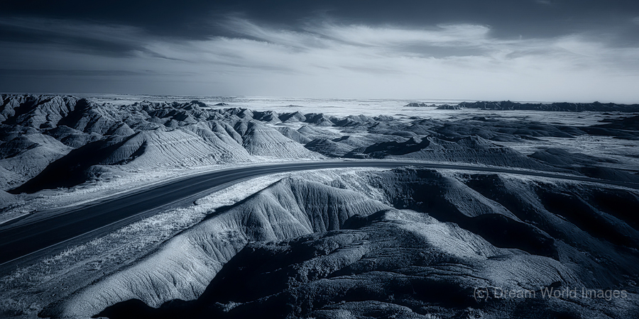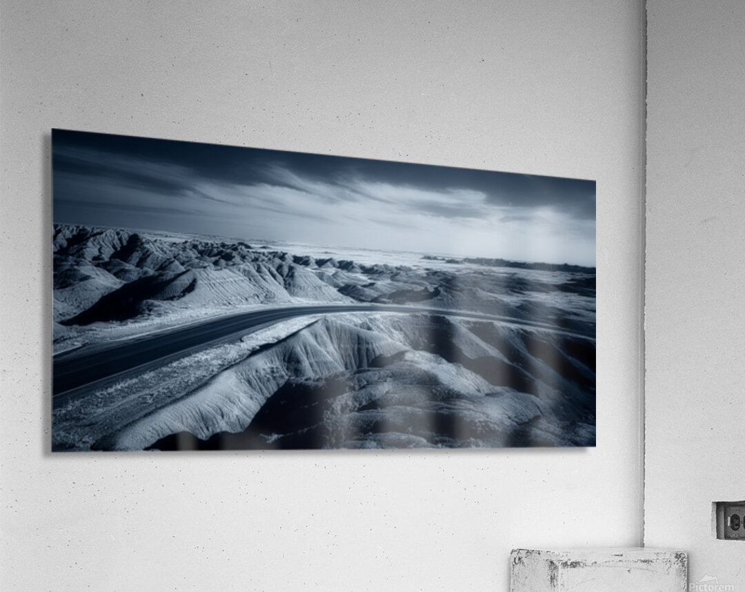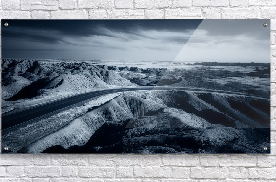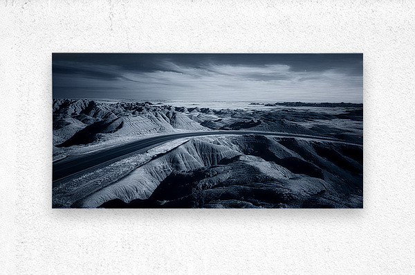 Step into the captivating world of mystery and intrigue with this mesmerizing work of art titled Ominous Road. Transport yourself to the Badlands in South Dakota as you meander through a barren otherworldly landscape where every twist and turn of the solitary road leads to an unknown destination. The rugged terrain of the Badlands with its deep crevices and rugged texture creates an eerie haunting mesmerizing atmosphere. As the winding path disappears into the distance one is left to ponder the secrets that lie beyond the horizon of this surreal monochromatic composition. This artwork exudes a sense of foreboding and wonder inviting you to delve deeper into the enigmatic realm captured within its frame. Explore the desolate beauty of the Badlands and let your imagination run wild with Ominous Road a piece that will transport you to a place of mystery and intrigue. Perfect for those seeking to add a touch of intrigue and wonder to their art collection this piece will surely spark conversation and captivate viewers with its enigmatic charm.