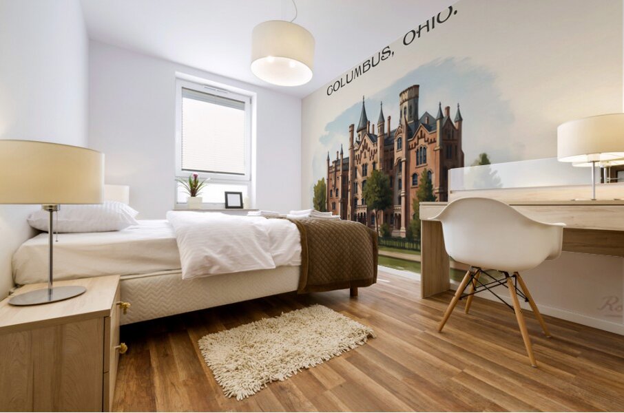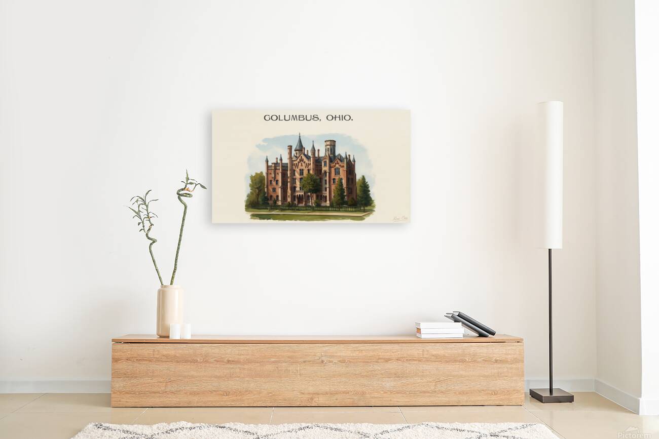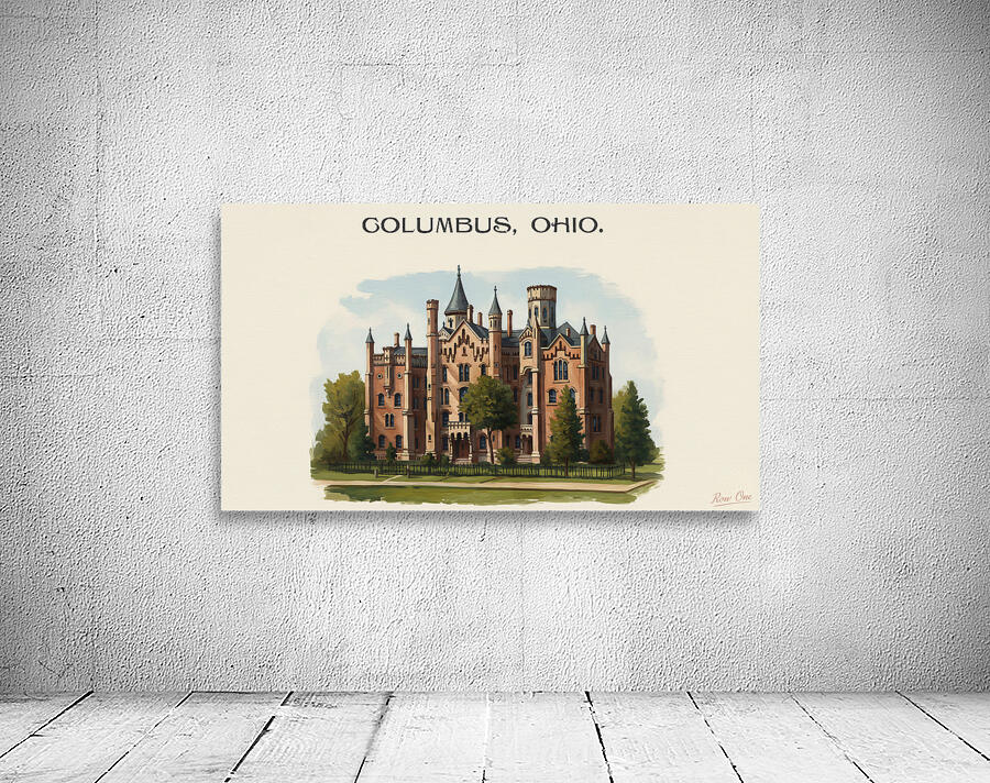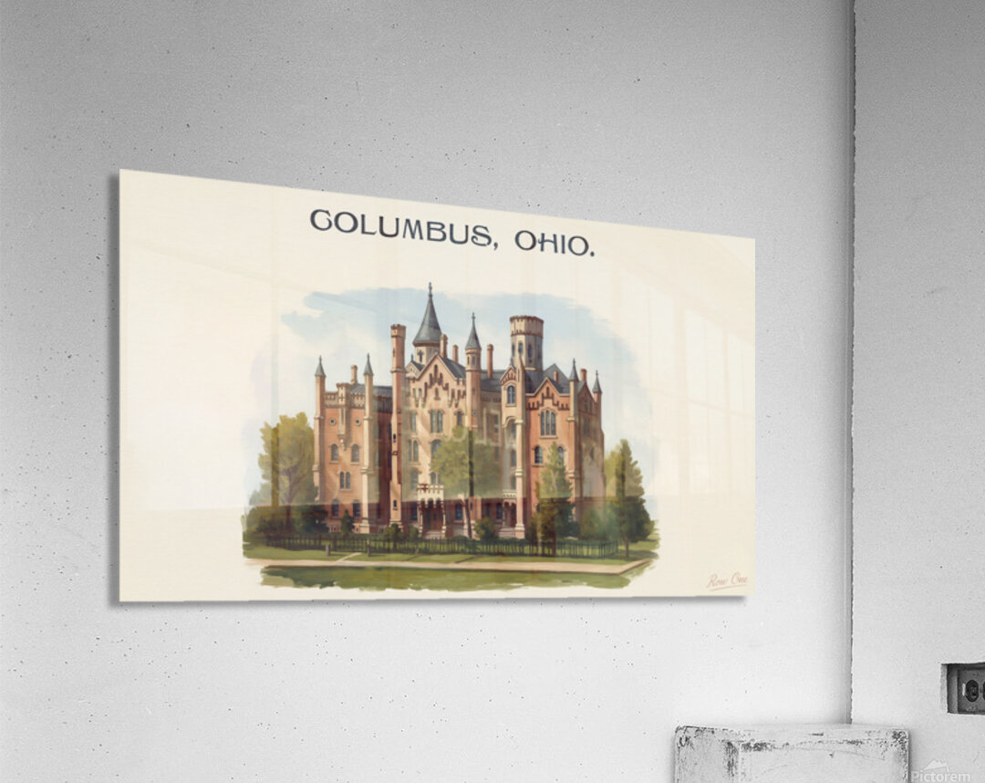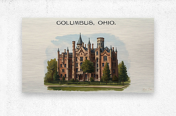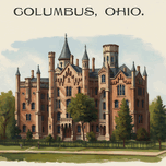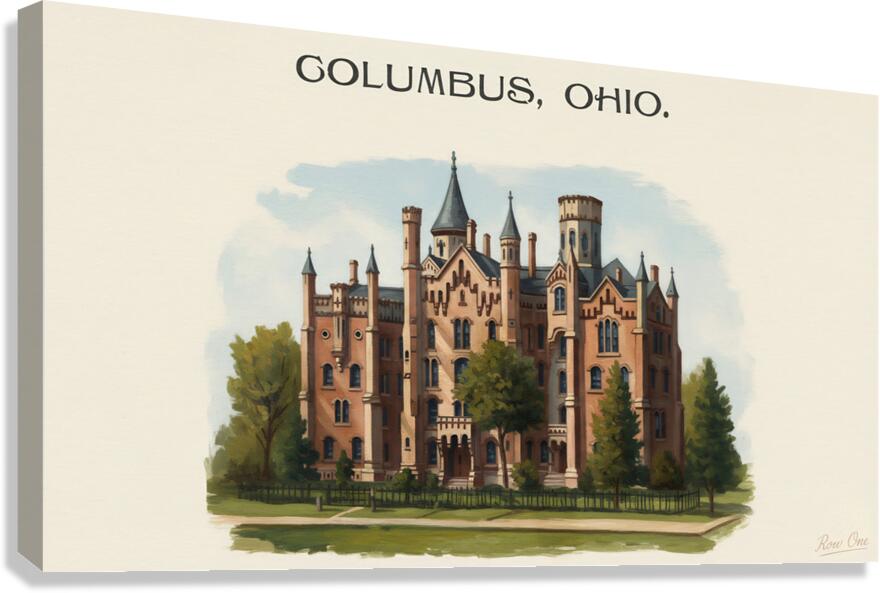 This late 1800s art showing Starling Medical College in Columbus (a Forerunner to The Ohio State University College of Medicine) is a beautiful art print showing Columbus over 125 years ago. Derivative art © 2025 Row One Brand