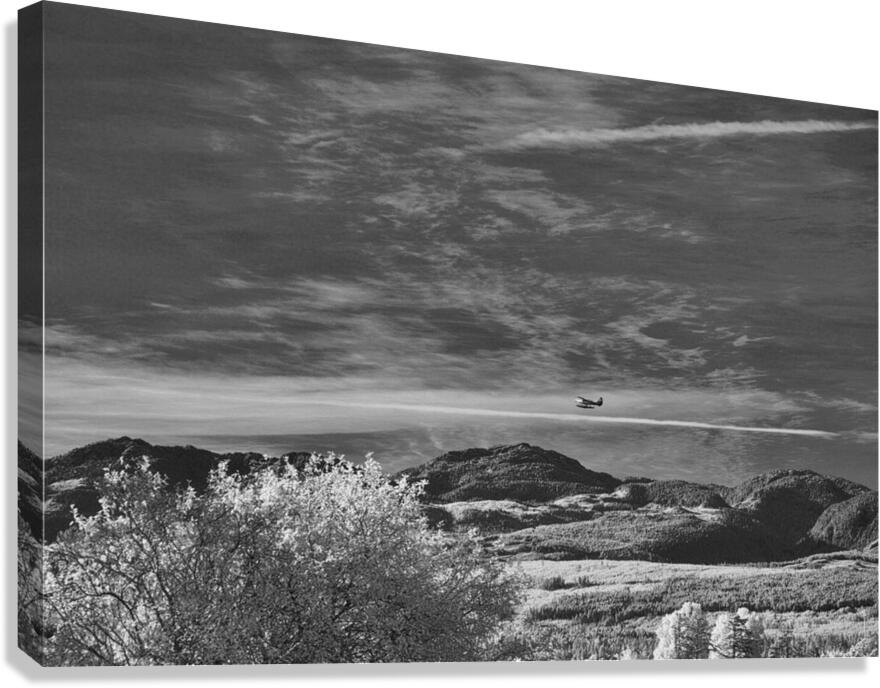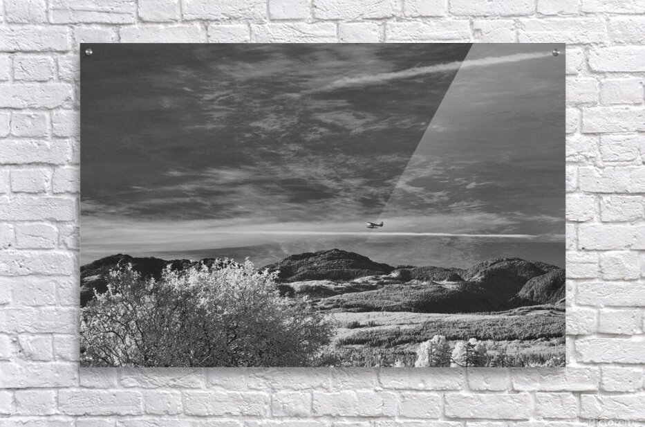 An observer sees a small airplane flying above a scenic mountain landscape creating a strong desire for travel. The scene is depicted in black and whi...[+]