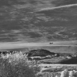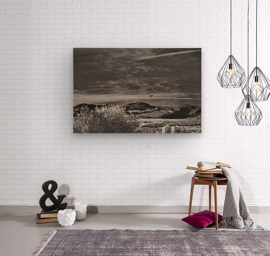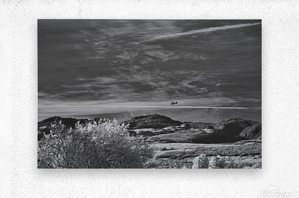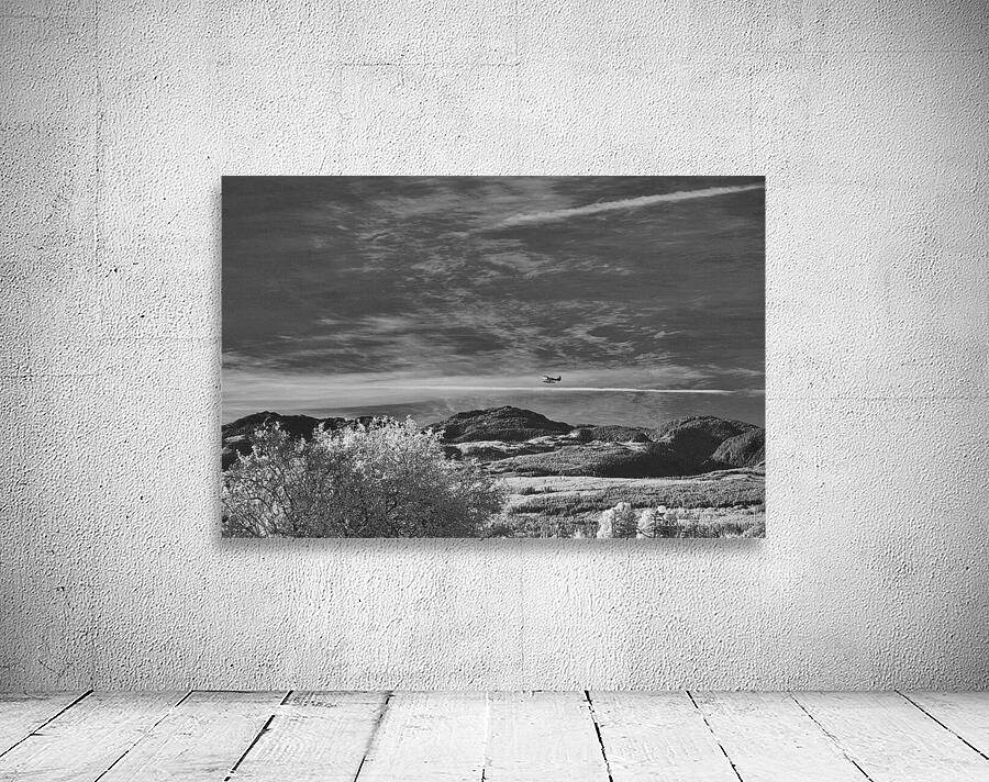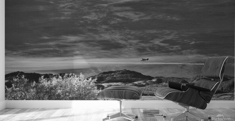 An observer sees a small airplane flying above a scenic mountain landscape creating a strong desire for travel. The scene is depicted in black and white, highlighting the sky and terrain.