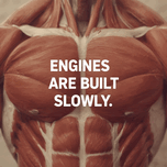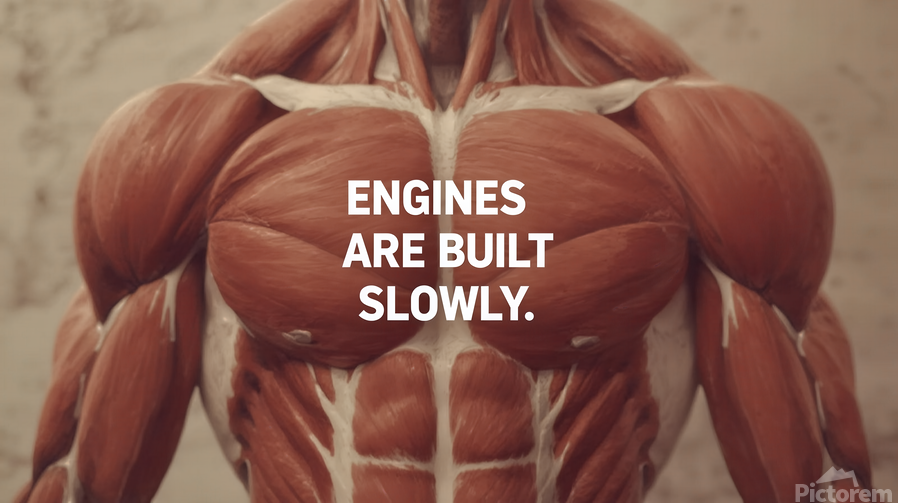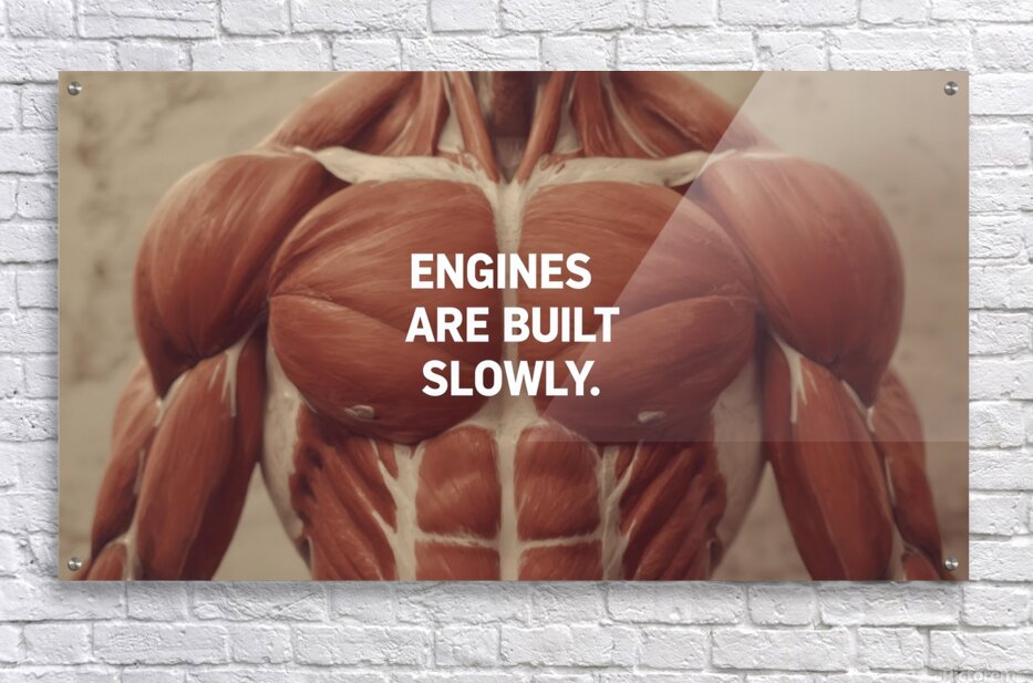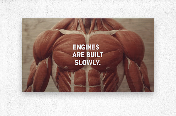 A striking anatomical illustration of the upper body with the bold message “Engines Are Built Slowly.” This design blends medical-grade muscle det...[+]
