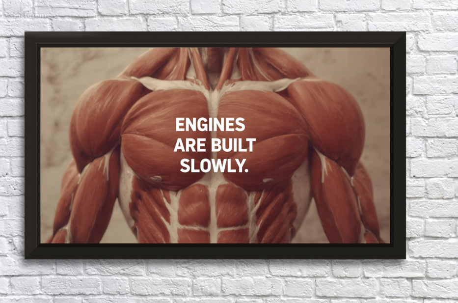 ENGINES ARE BUILT SLOWLY — MUSCULAR ANATOMY MOTIVATION POSTER