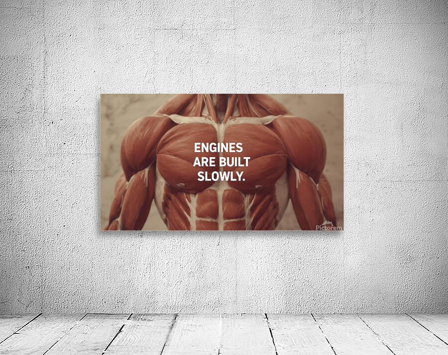 A striking anatomical illustration of the upper body with the bold message “Engines Are Built Slowly.” This design blends medical-grade muscle detail with gym-ready motivation, celebrating patient progress, recovery, and disciplined training. Ideal for home gyms, clinics, and studios, it spotlights the pectorals, deltoids, and abdominals in motion—reminding athletes that strength is engineered over time through consistency and smart work. Perfect as wall art, a teaching aid, or a daily cue to trust the process.