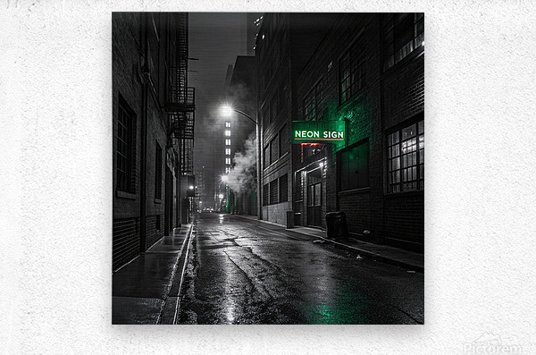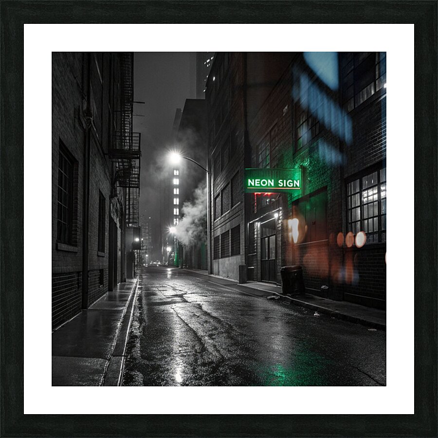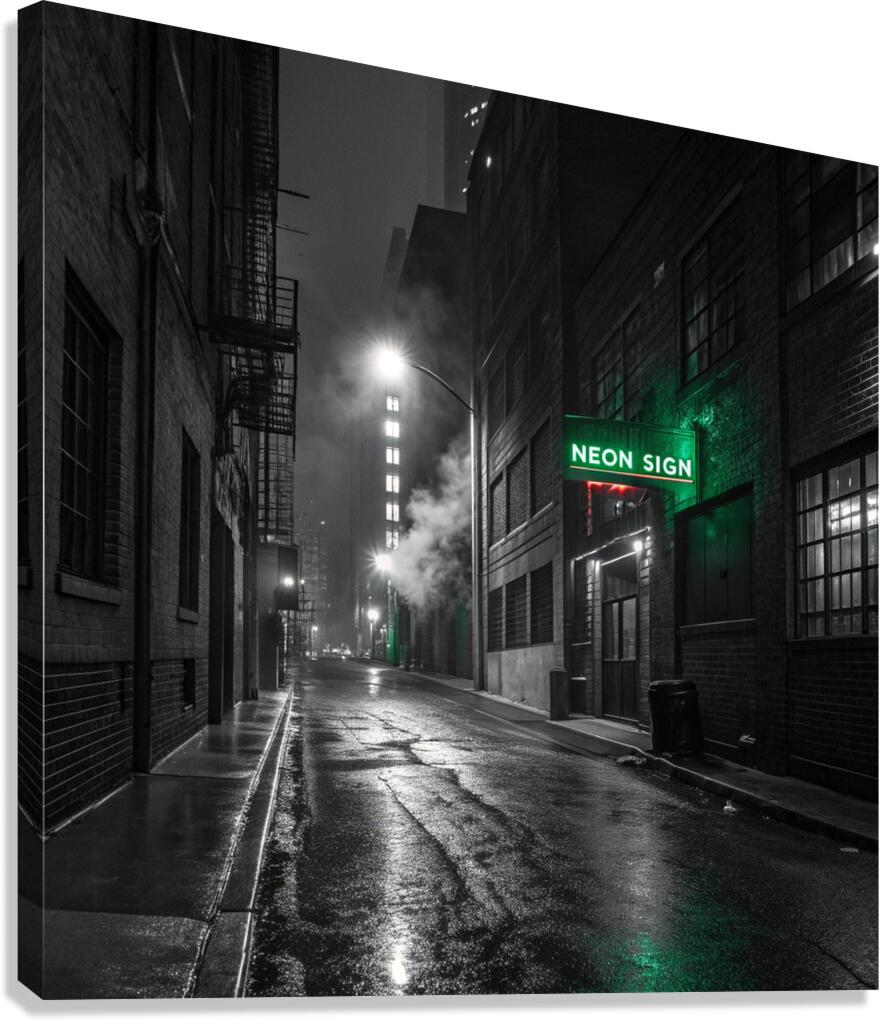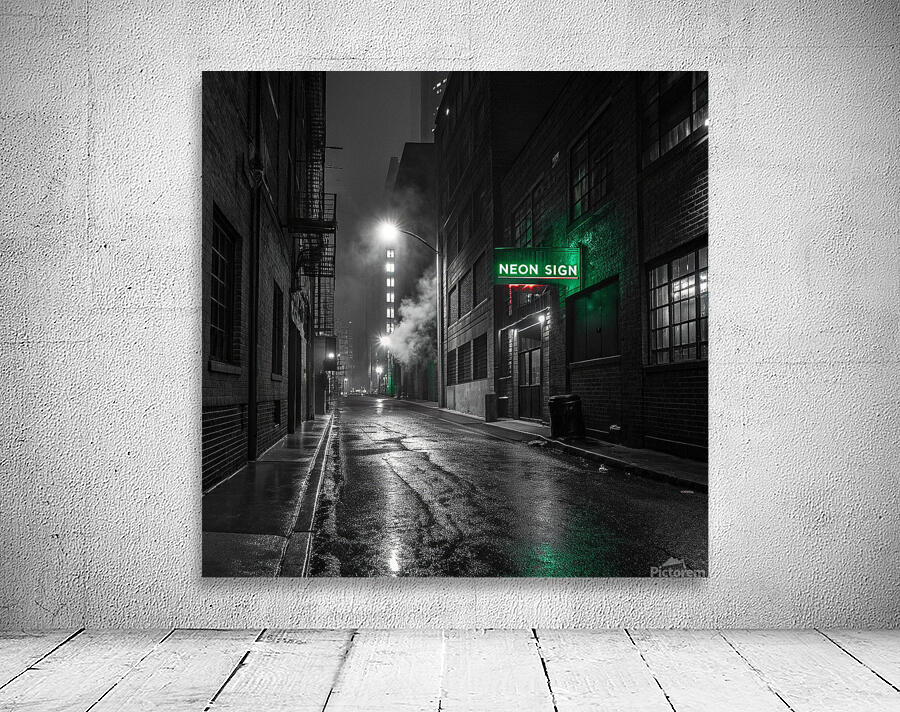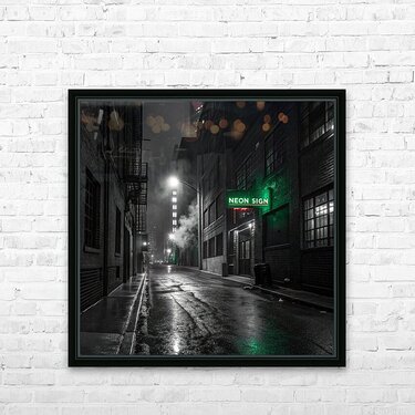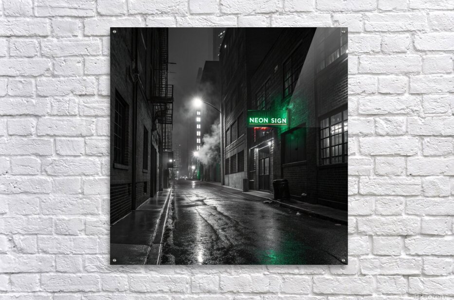 A striking, hyper-realistic piece that captures the mystery of a Neo-Noir film scene. The desolate, rain-slicked alley is rendered in intense black and white, save for the lonely, piercing glow of a single neon sign. The heavy contrast and deep shadows create a powerful, atmospheric mood. Perfect for lofts, dens, or any space that embraces a sophisticated, urban edge. Looks fantastic on Metal or Acrylic for maximum reflection