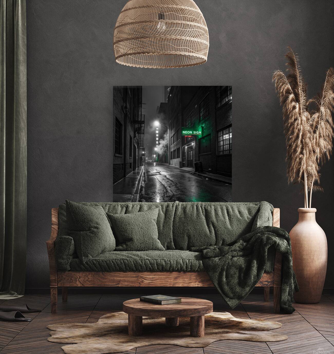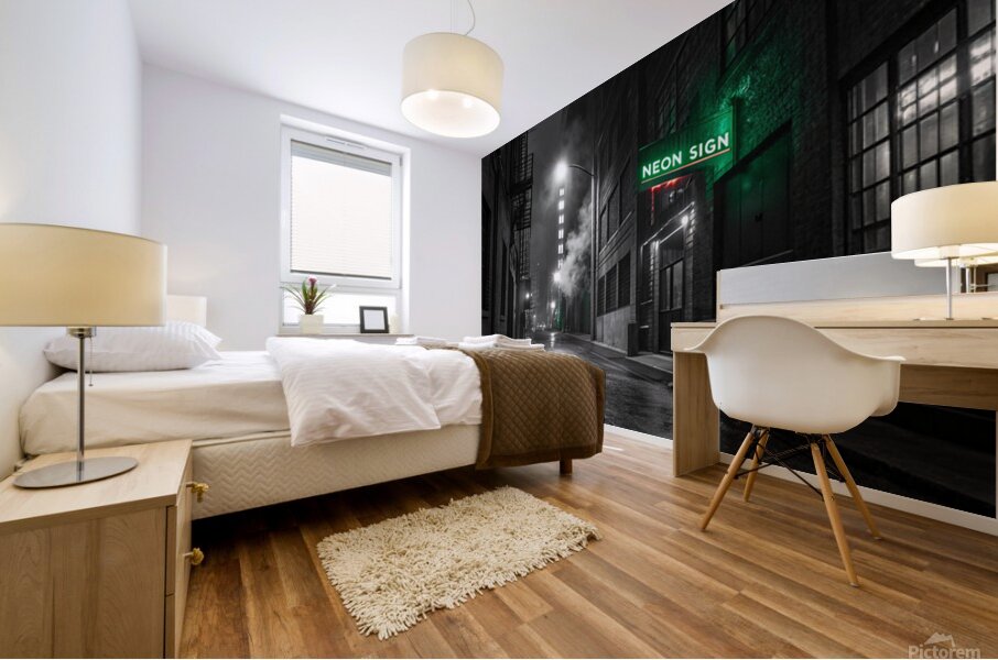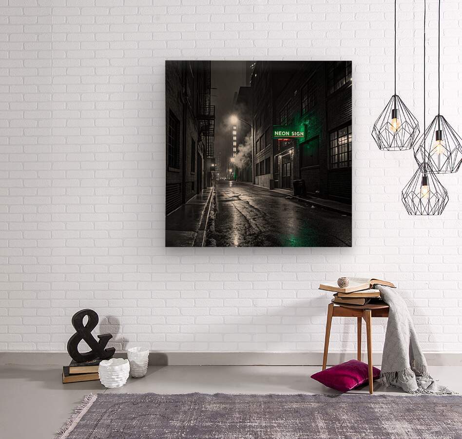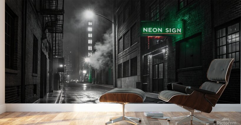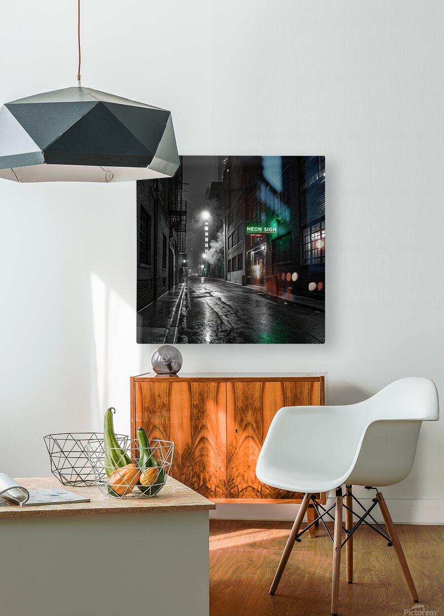 A striking, hyper-realistic piece that captures the mystery of a Neo-Noir film scene. The desolate, rain-slicked alley is rendered in intense black and white, save for the lonely, piercing glow of a single neon sign. The heavy contrast and deep shadows create a powerful, atmospheric mood. Perfect for lofts, dens, or any space that embraces a sophisticated, urban edge. Looks fantastic on Metal or Acrylic for maximum reflection