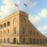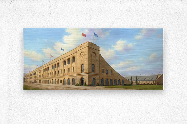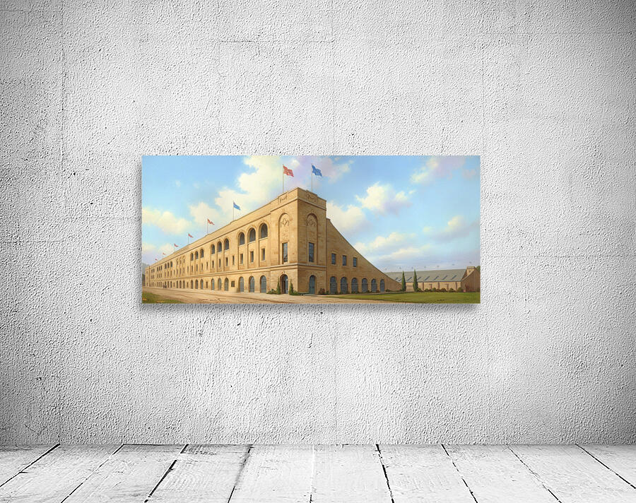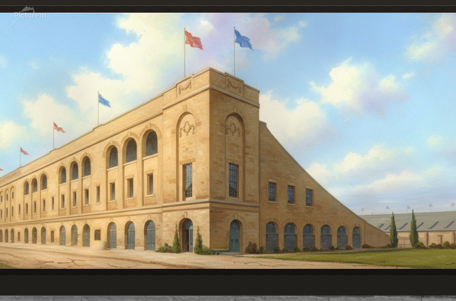 This Row One Brand vintage college football stadium art shows historic Ownby Stadium in Dallas. The home of the SMU Mustangs, this stadium was built in 1926. This mixed media painting shows it in the 1930s. Derivative art © 2025 Row One Brand
