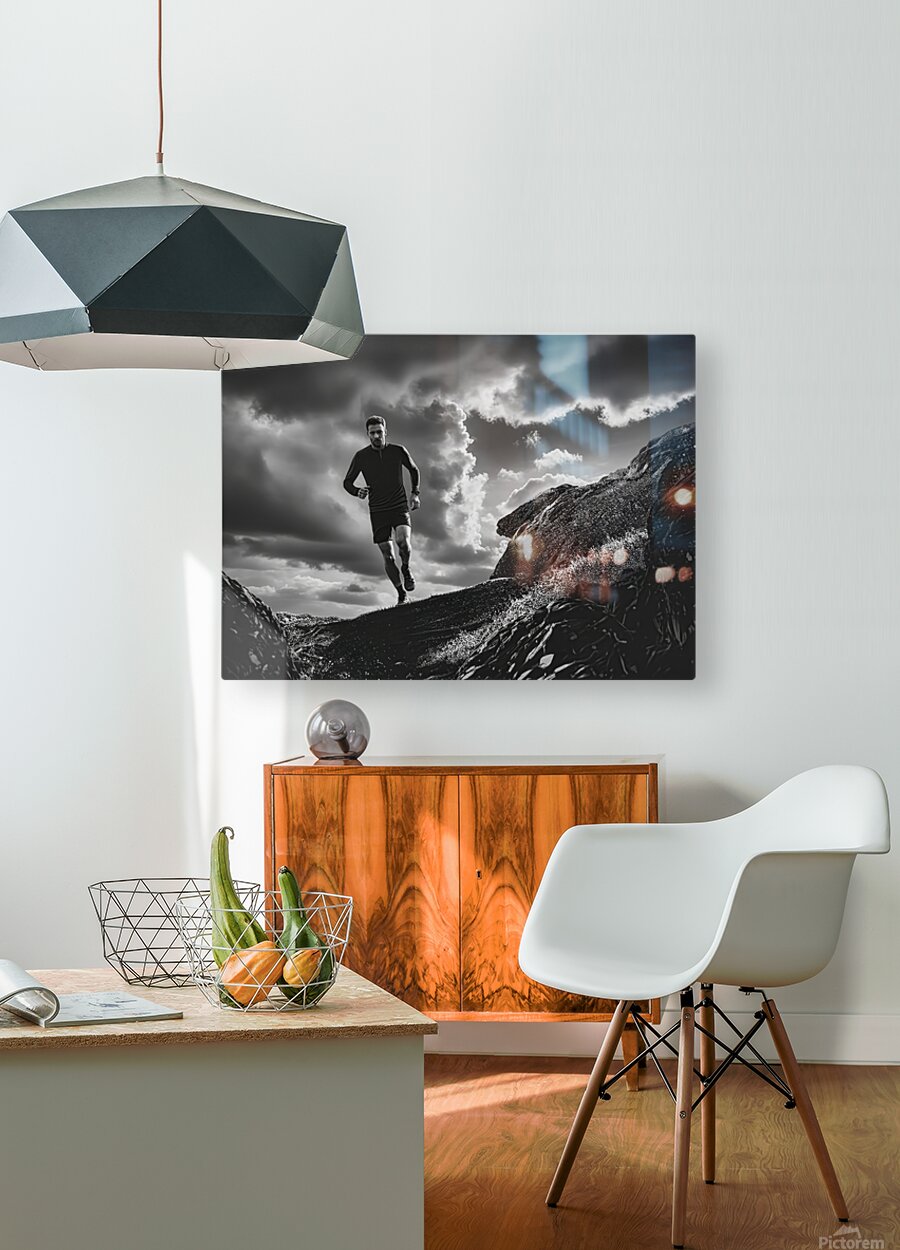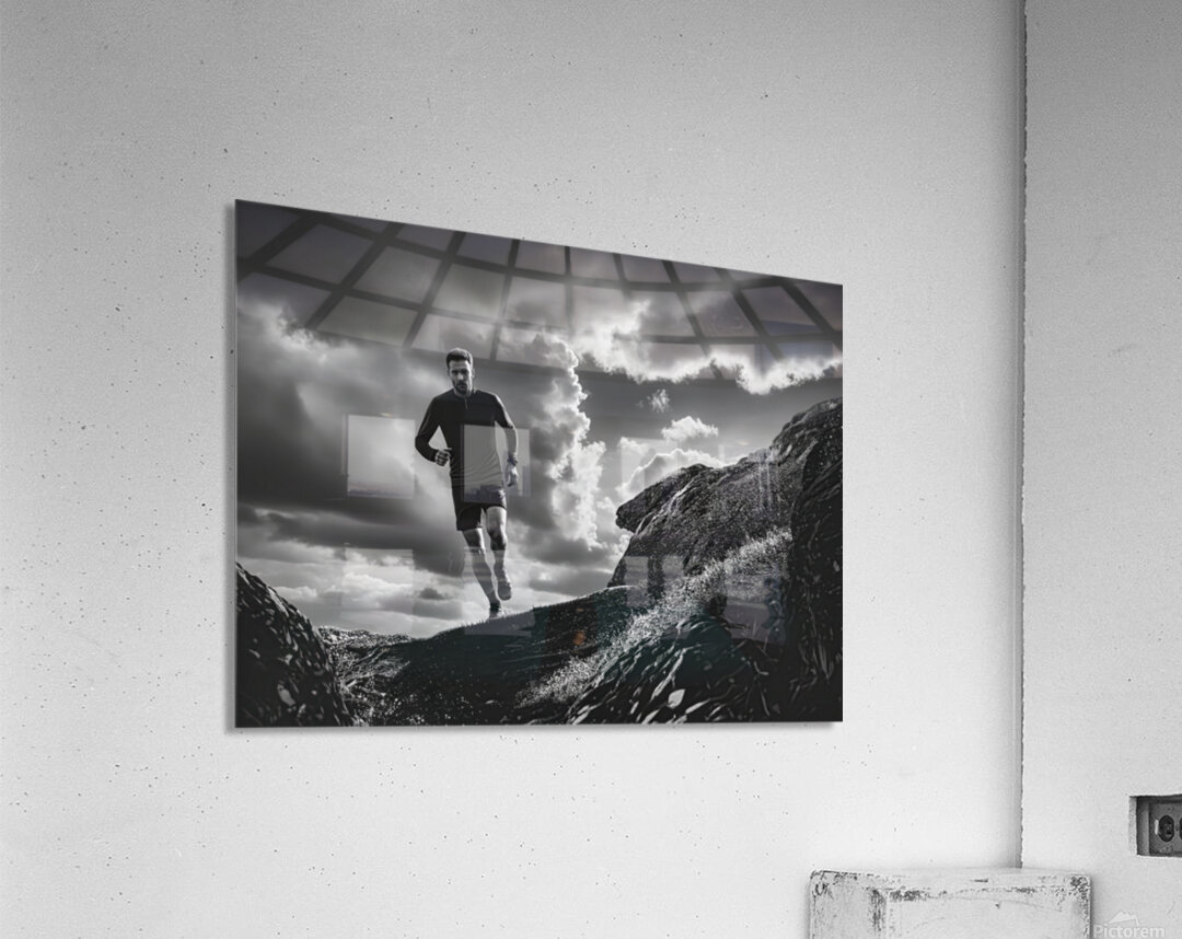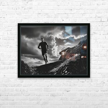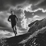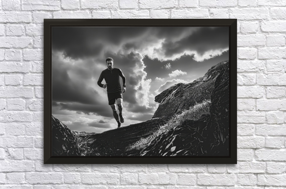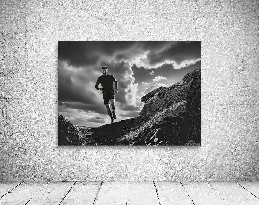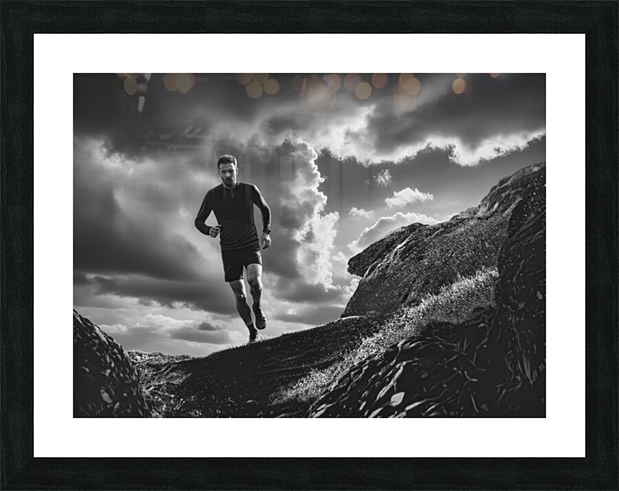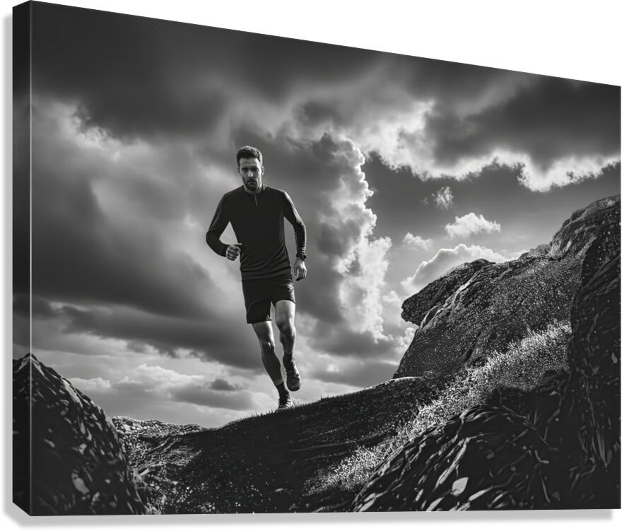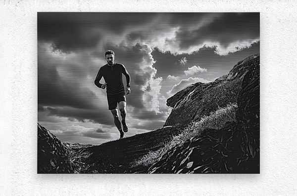 A lone runner charges across a jagged ridge as storm clouds boil overhead. The monochrome tones emphasize texture, motion, and resolve—capturing the...[+]