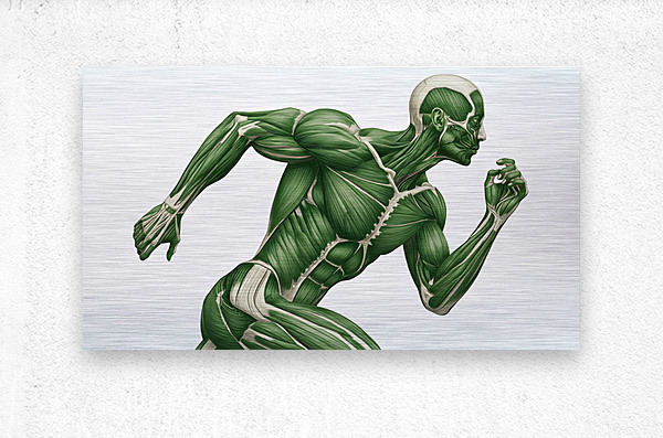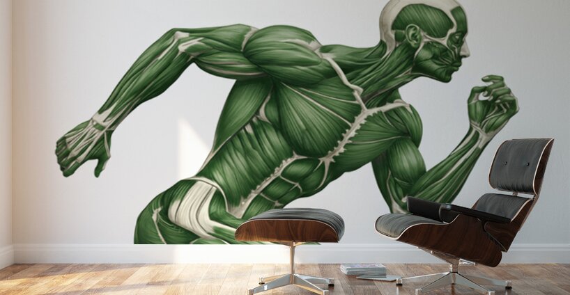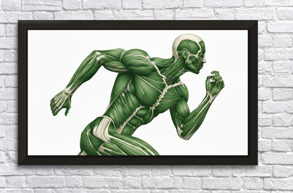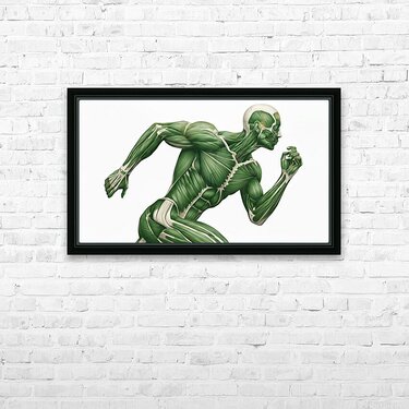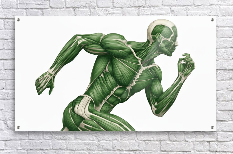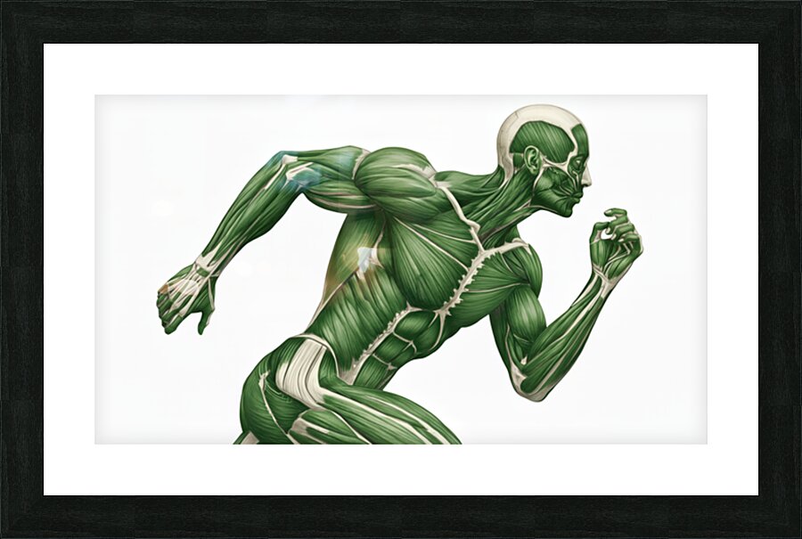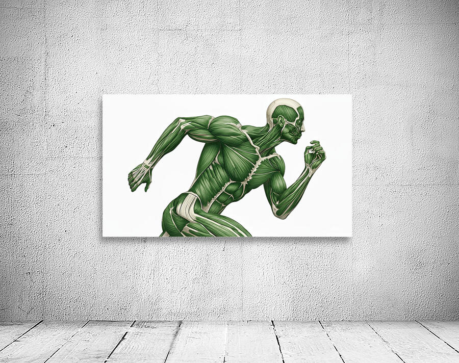 A green-toned illustration reveals the working muscular system of a runner mid-stride. Major groups in the arms, core, and legs are clearly defined to show how coordinated chains create speed, stability, and power. Equal parts study aid and motivational art—ideal for classrooms, clinics, coaching spaces, and gym décor.