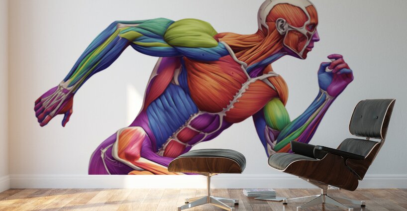 A vivid illustration of a runner with exposed, color-segmented musculature that maps major muscle groups engaged in sprinting. The piece highlights ar...[+]