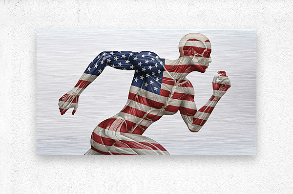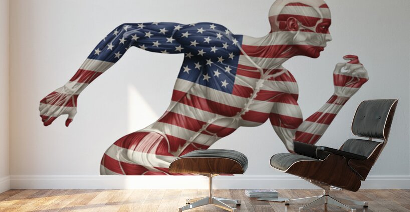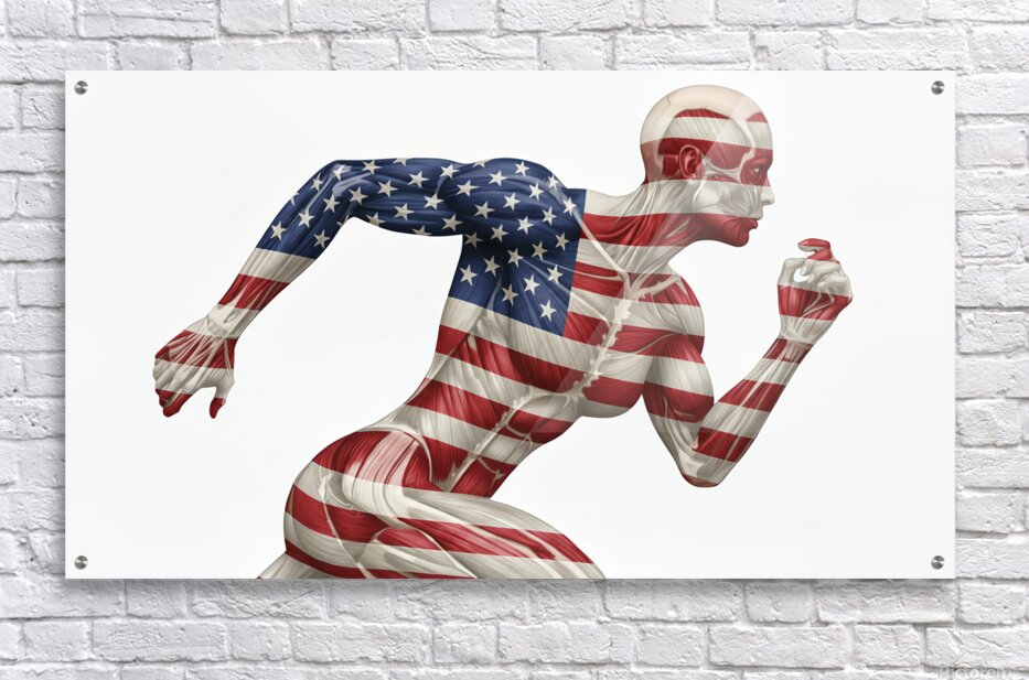 This image is a dynamic anatomical illustration of the human muscular system, shown in a sprinting position with the United States flag overlaying the body. The stars and stripes flow across the muscle structure, symbolizing patriotism, strength, and athletic performance. The design blends scientific anatomical detail with bold patriotic artistry, making it well-suited for sports branding, fitness spaces, educational posters, or patriotic décor. It captures the spirit of motion, resilience, and American pride.