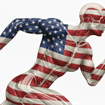 This image is a dynamic anatomical illustration of the human muscular system, shown in a sprinting position with the United States flag overlaying the...[+]