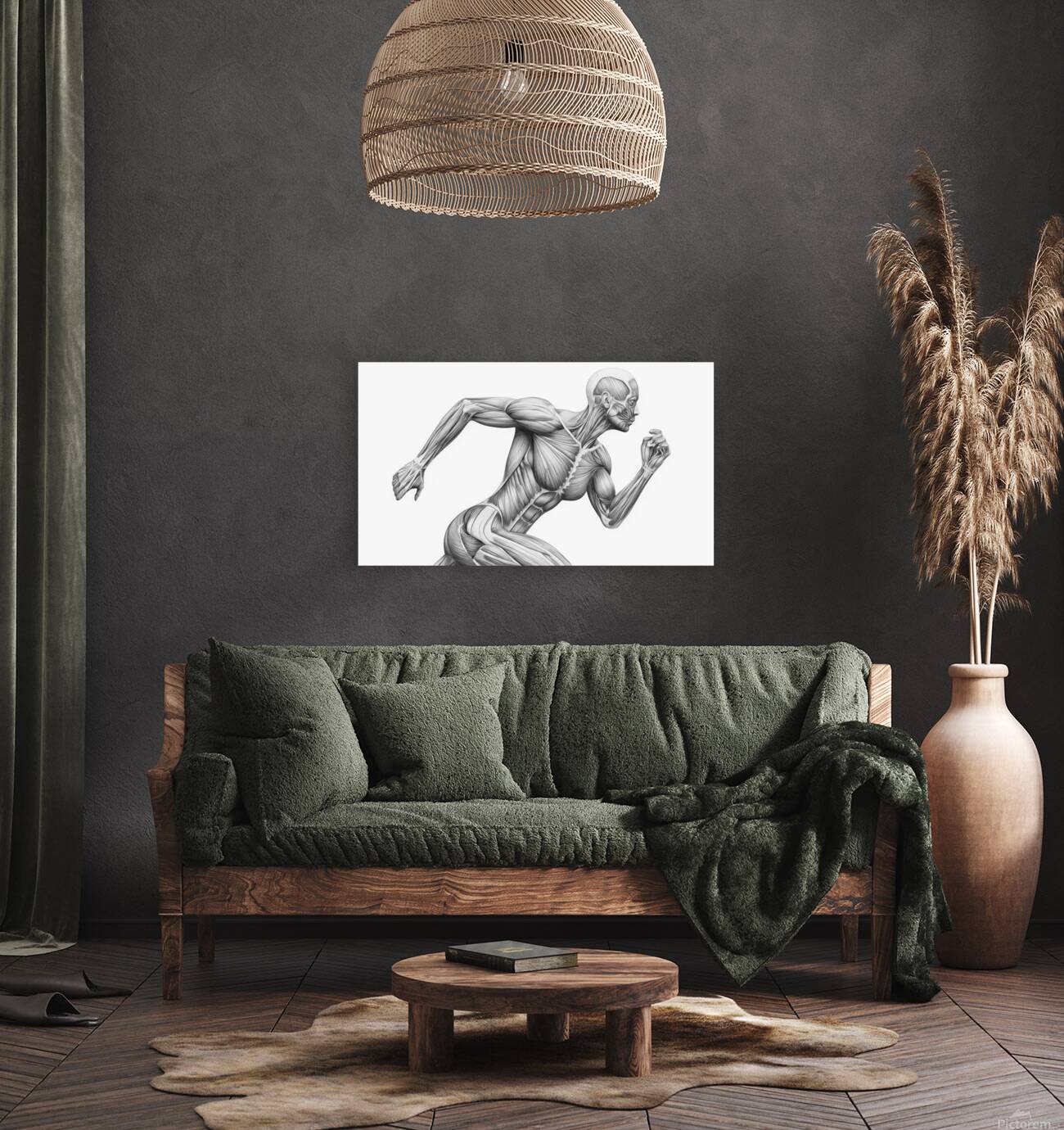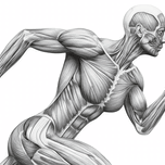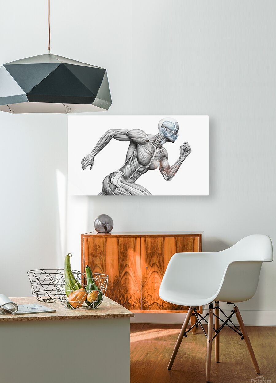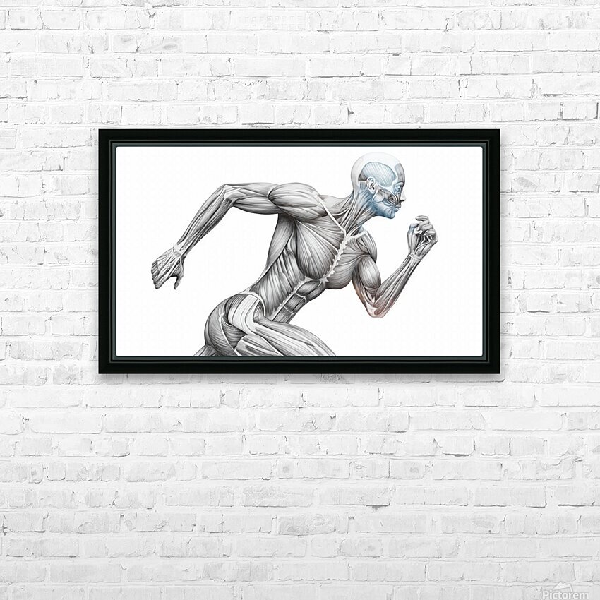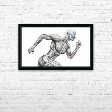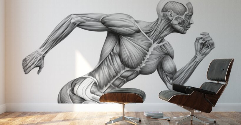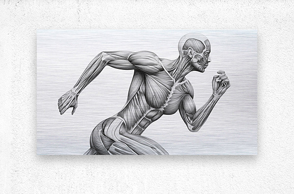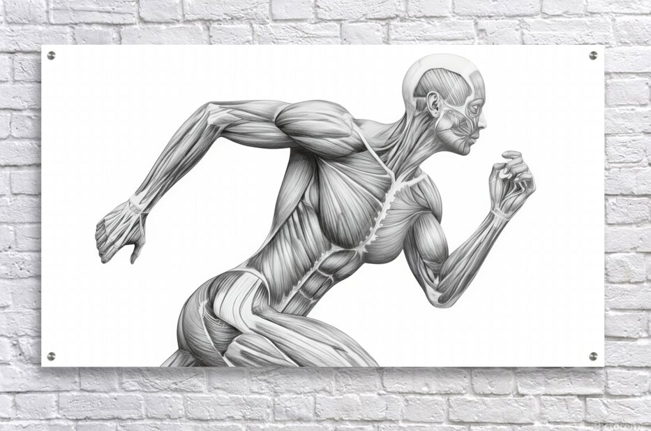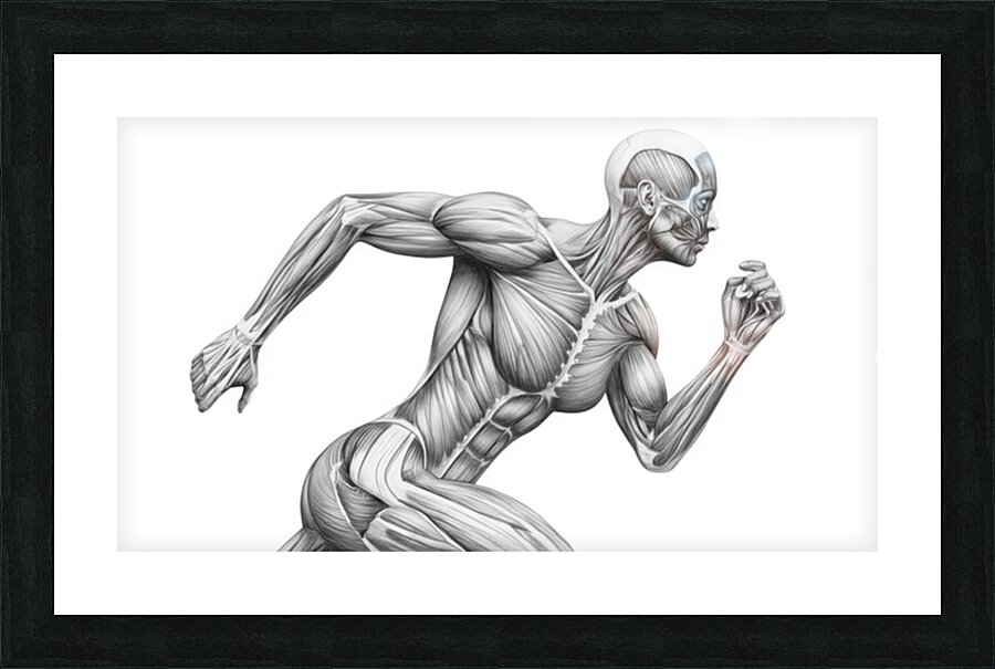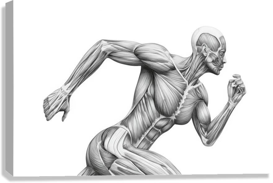 A finely shaded graphite illustration shows a runner mid-stride with the skin removed to reveal working muscle groups. The clean, monochrome treatment highlights fiber direction, tendons, and core stabilization, turning motion into a clear anatomy lesson. Ideal for classrooms, PT clinics, coaching studios, and gym décor—an elegant reference to how coordinated musculature produces speed, posture, and power.