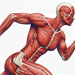 This image is a highly detailed anatomical illustration of the female human muscular system shown in a running position. The figure highlights the major muscle groups of the body—including the arms, shoulders, chest, core, and legs—demonstrating how muscles engage dynamically during athletic motion. With fine shading and definition, the image captures the strength, coordination, and biomechanics of sprinting, making it ideal for use in educational materials, sports science, fitness training, and medical anatomy references.