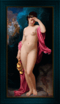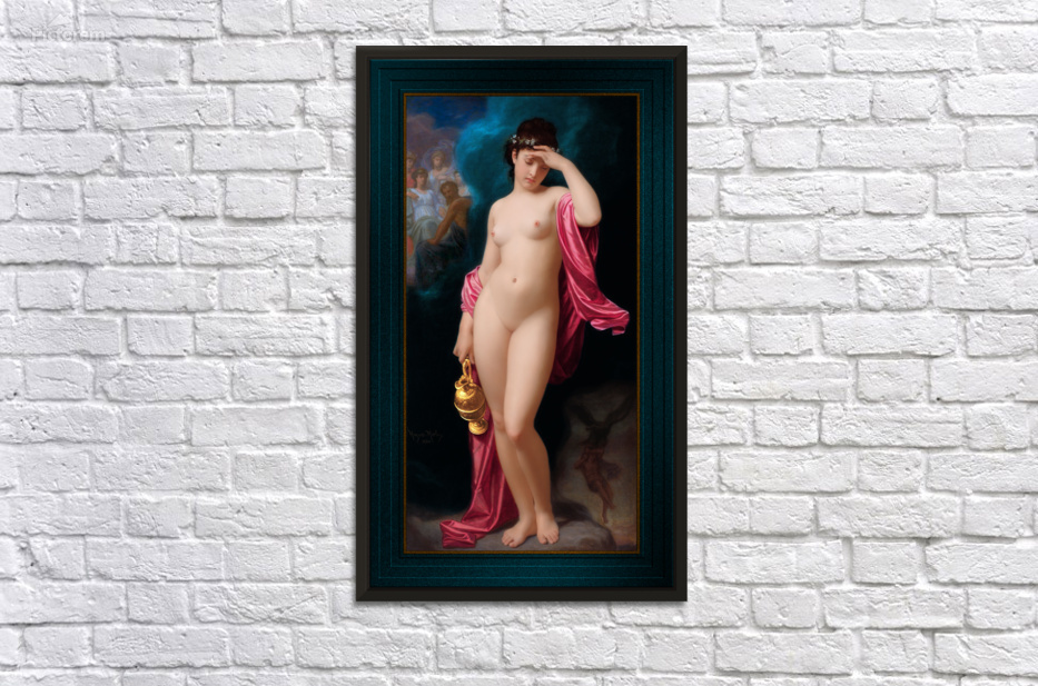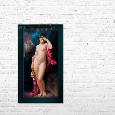 Hebe After The Fall c~1880 by French Painter Hugues Merle (1822 - 1881); who specialized in paintings that depicted sentimental heart warming scenes and moral subject matter; and who's work is often compared to that of French Painter William-Adolphe Bouguereau. This is artwork is based on Ancient Greek mythology, which shows the Hebe, the Goddess of youth and also the daughter of Zeus and Hera; as the cup-bearer to the Gods, serving them nectar and ambrosia...