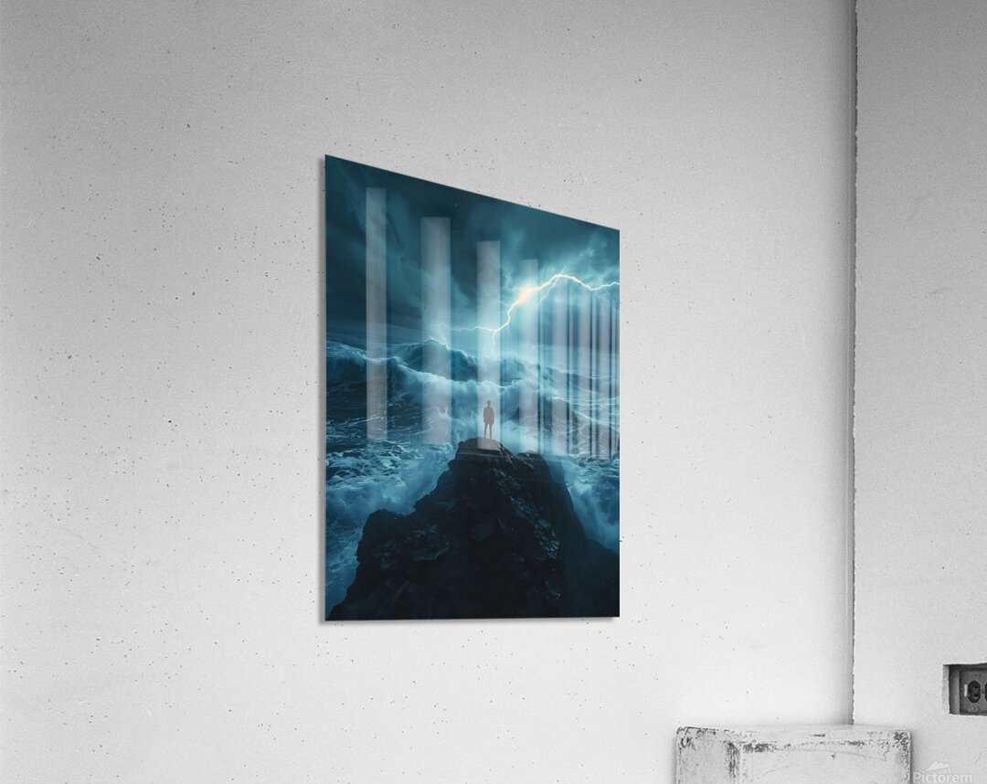 ABOUT THIS ARTWORK: MAN STANDING ON ROCK AMID STORMY OCEAN AND LIGHTNING – DRAMATIC AND POWERFUL SCENE
