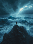 MAN STANDING ON ROCK AMID STORMY OCEAN AND LIGHTNING – DRAMATIC AND POWERFUL SCENE