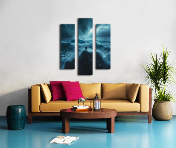 MAN STANDING ON ROCK AMID STORMY OCEAN AND LIGHTNING – DRAMATIC AND POWERFUL SCENE INSPIRE ART  Canvas Print