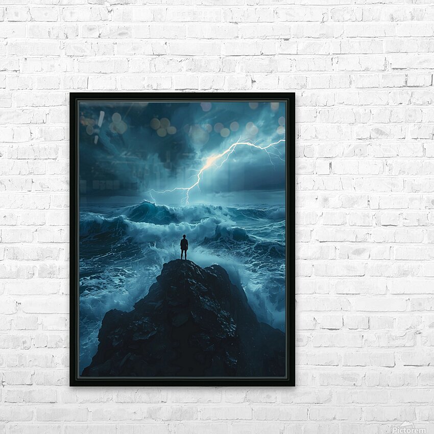 Man Standing on Rock Amid Stormy Ocean and Lightning – Dramatic and Powerful Scene Wall Decor Frame