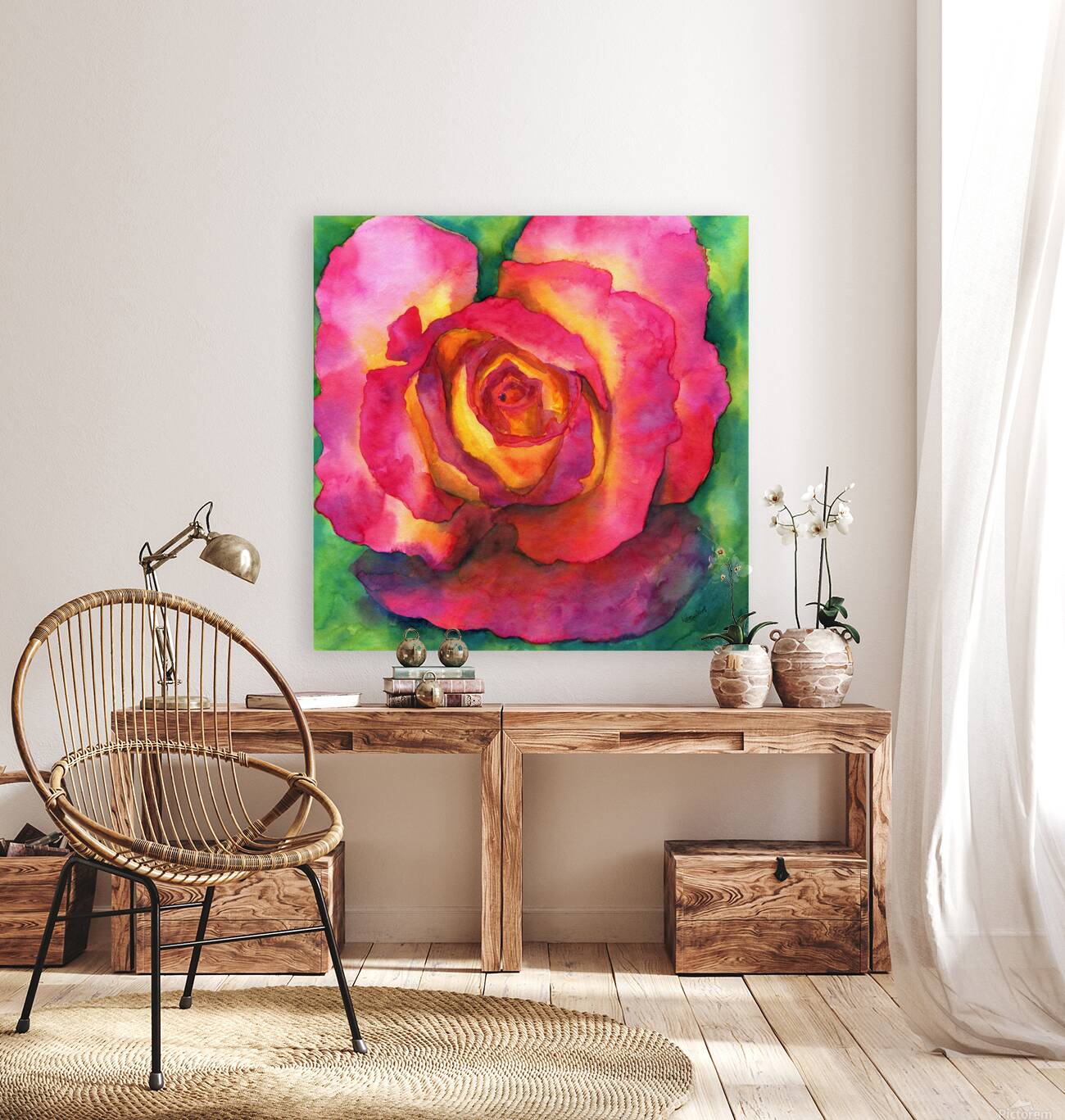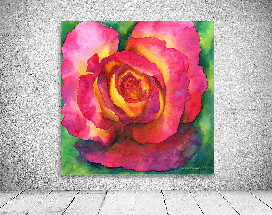 The Beautiful Rose is a hand-painted watercolor painting in contemporary square format painted by Karen Kaspar. It is depicting a beautiful rose in vibrant shades of pink, red, orange and yellow on a contrasting abstracted green background. Who can resist a beautiful rose? In a summer garden the beautiful rose blossoms in vibrant colors grab the attention of every garden visitor. The eyes are enjoying the bright colours and the various shapes of the petals. Then the sweet scent of the flowers is fascinating not only the human being, but also the bees and butterflies and many other little insects. A delight for all senses. Enjoy! Fine art prints and home decor from original artwork, paintings and photographs by artist Karen Kaspar. 136